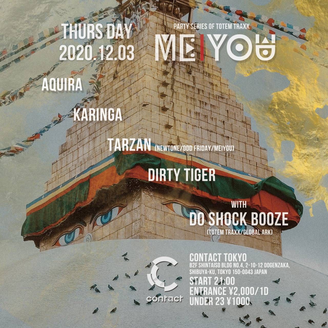 自身も強く影響を受けたと語るAndrew Weatherallを色濃く反映させた没入的なサイケデリアを広げるAQUIRAと、フォーマットを無視したイマジネーションの膨張と幻覚的な音像を映すKaringa、DIRTY TIGERのトリッピーな展開に、MEiYOUの首謀者Do Shock Boozeと同レーベル所属のTARZANのアップリフティングなセットとの交わりはダンスミュージックの快楽要素を凝縮したユートピア創造を実現させる。今までのMEiYOUからさらにクリエイティブかつサイケデリックに発展した音場はこの夜を燃焼させようと試みるダンスミュージックフリークに完全な忘我を味わわせてくれるだろう。
