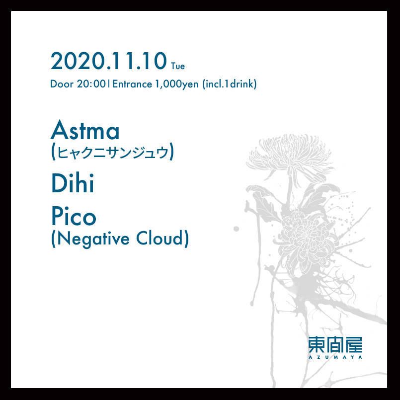 2020.11 10 NOV Azumaya -Tuesday- TECHNO 0 Shares Facebook Twitter google Line DATE: 2020-11-10 TUE OPEN: 20:00 VENUE: PRICE: Entrance 1,000yen(incl. 1drink) LINE UP: Astma (ヒャクニサンジュウ) Dihi Pico (Negative Cloud)