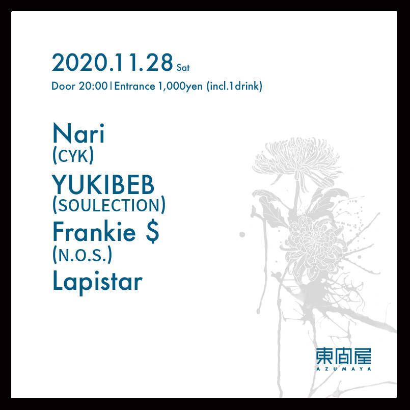 2020.11 28 NOV Azumaya -Saturday HOUSE DISCO 0 Shares Facebook Twitter google Line DATE: 2020-11-28 SAT OPEN: 20:00 VENUE: PRICE: Entrance 1,000yen(incl. 1drink) LINE UP: Nari (CYK) YUKIBEB (SOULECTION) Frankie $ (N.O.S.) Lapistar