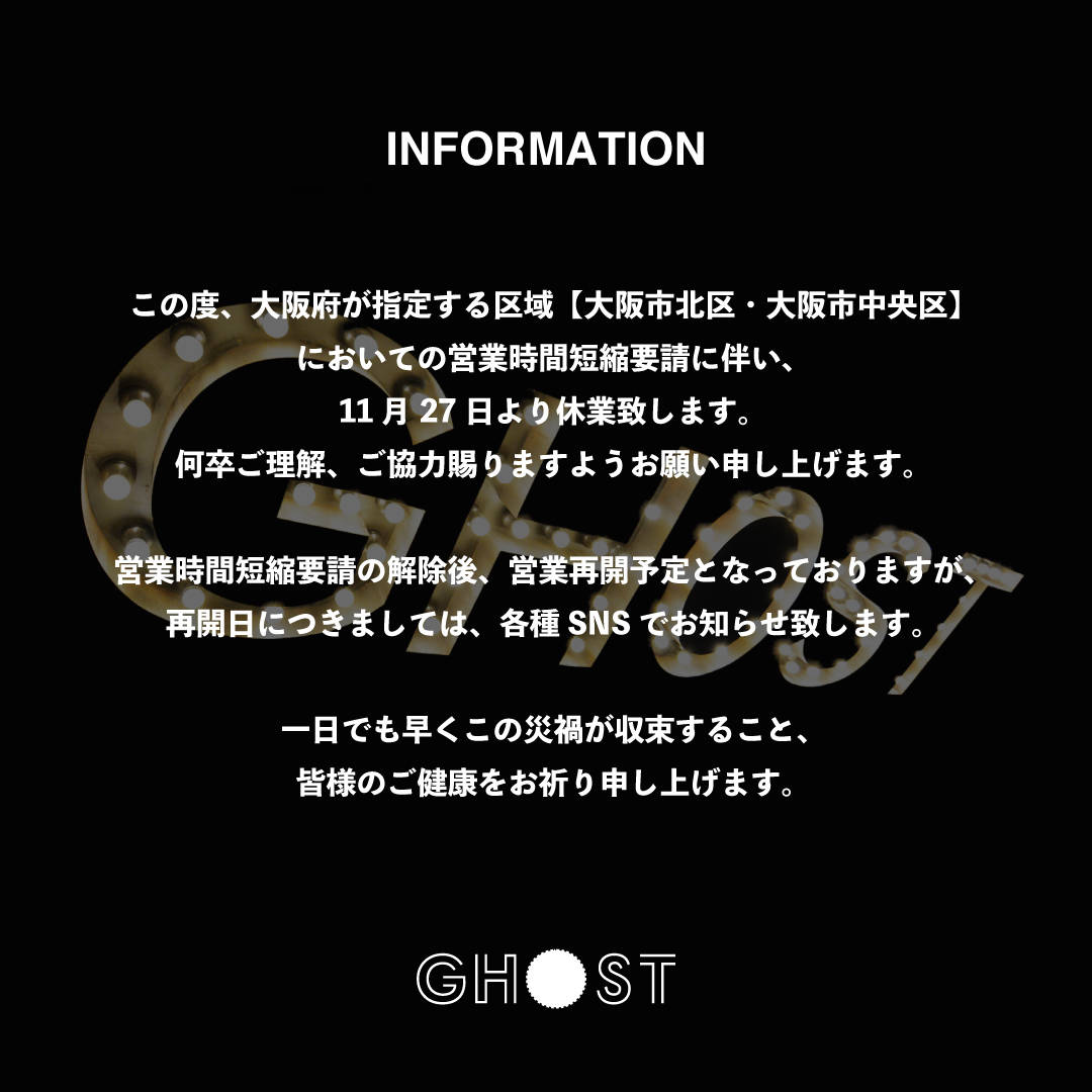 この度、大阪府が指定する区域【大阪市北区・大阪市中央区】においての営業時間短縮要請に伴い、11月27日より休業致します。