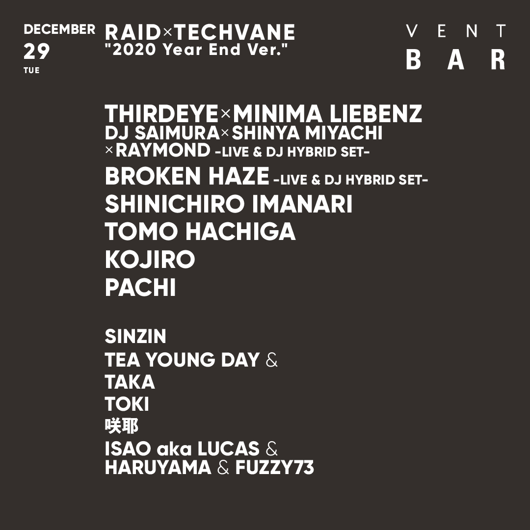 【 12月29日のVENT BARは、DJ SAIMURAとBROKEN HAZE率いるRAID × TECHVANEがYEAR-END SPを開催!! 】