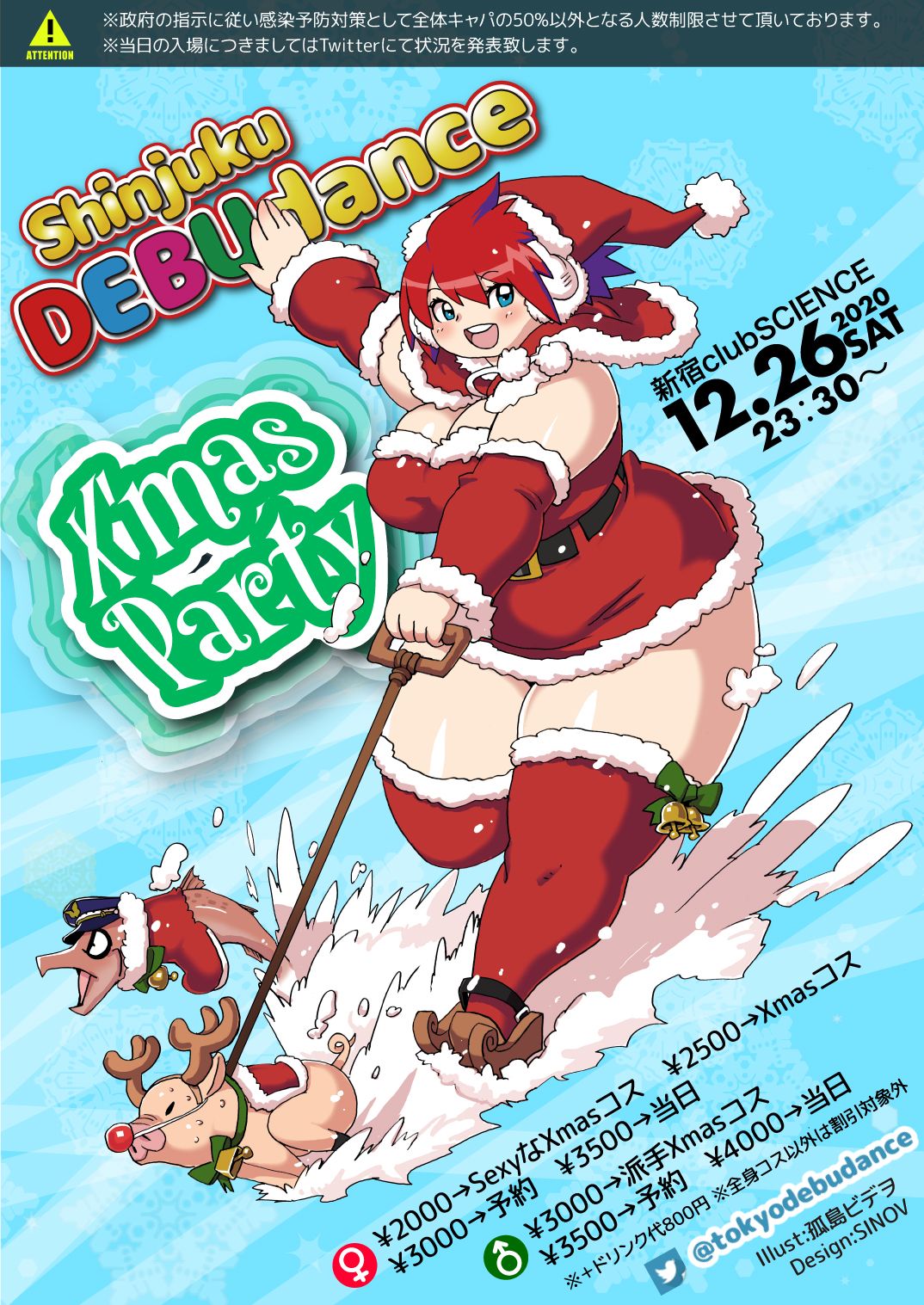 - [女性] (ドレスコード割引) 2000→SexyなXmasコス 2500→Xmasコス (通常) 3000→予約 3500→当日 [男性] (ドレスコード割引) 3000→派手Xmasコス (通常) 3500→予約 4000→当日