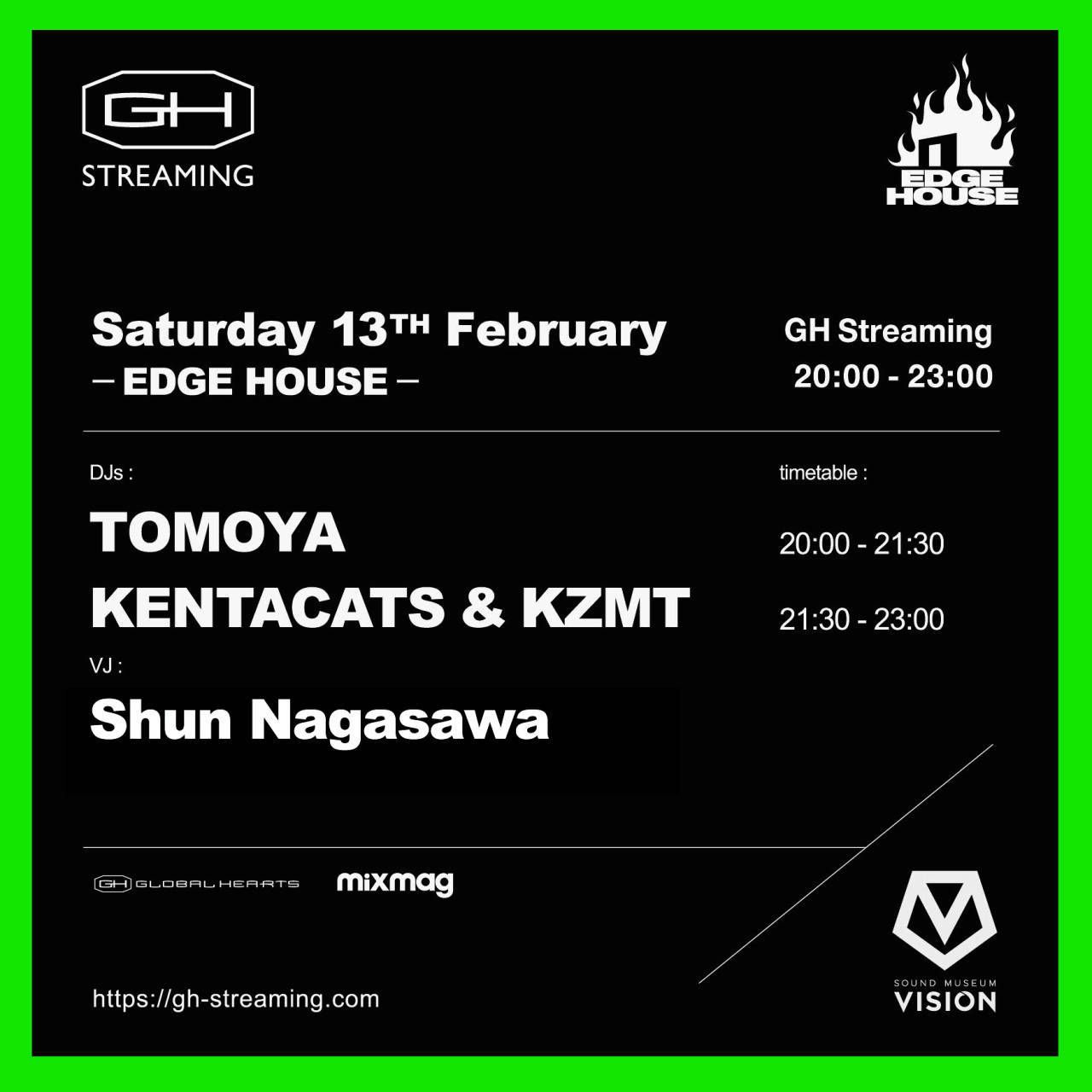 世界中で巻き起こっている良質でカッティングエッジな”ハウス/テックハウス旋風”を体現するSound Museum Visionレギュラーパーティ「EDGE HOUSE」がGH STREAMINGに登場。レジデントDJ陣がダンスフロアへお連れします。