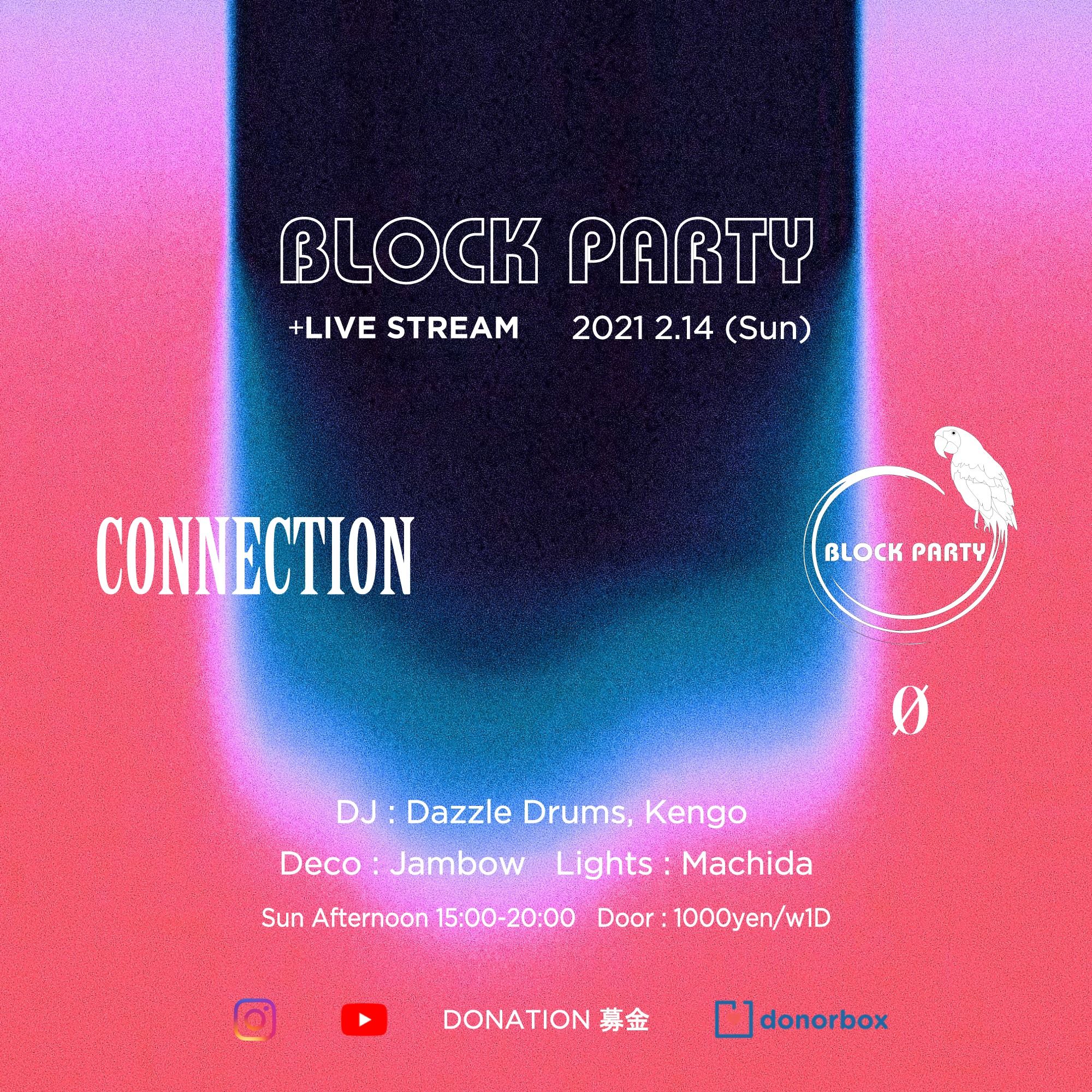 In this situation at COVID-19, this time Block Party will be broadcasting from 0 Zero again at 15:00-20:00 JST on Sunday, Feb 14th. The DJ Set will be live on 0 Zero YouTube and Block Party Instagram at 15:00-20:00 JST.