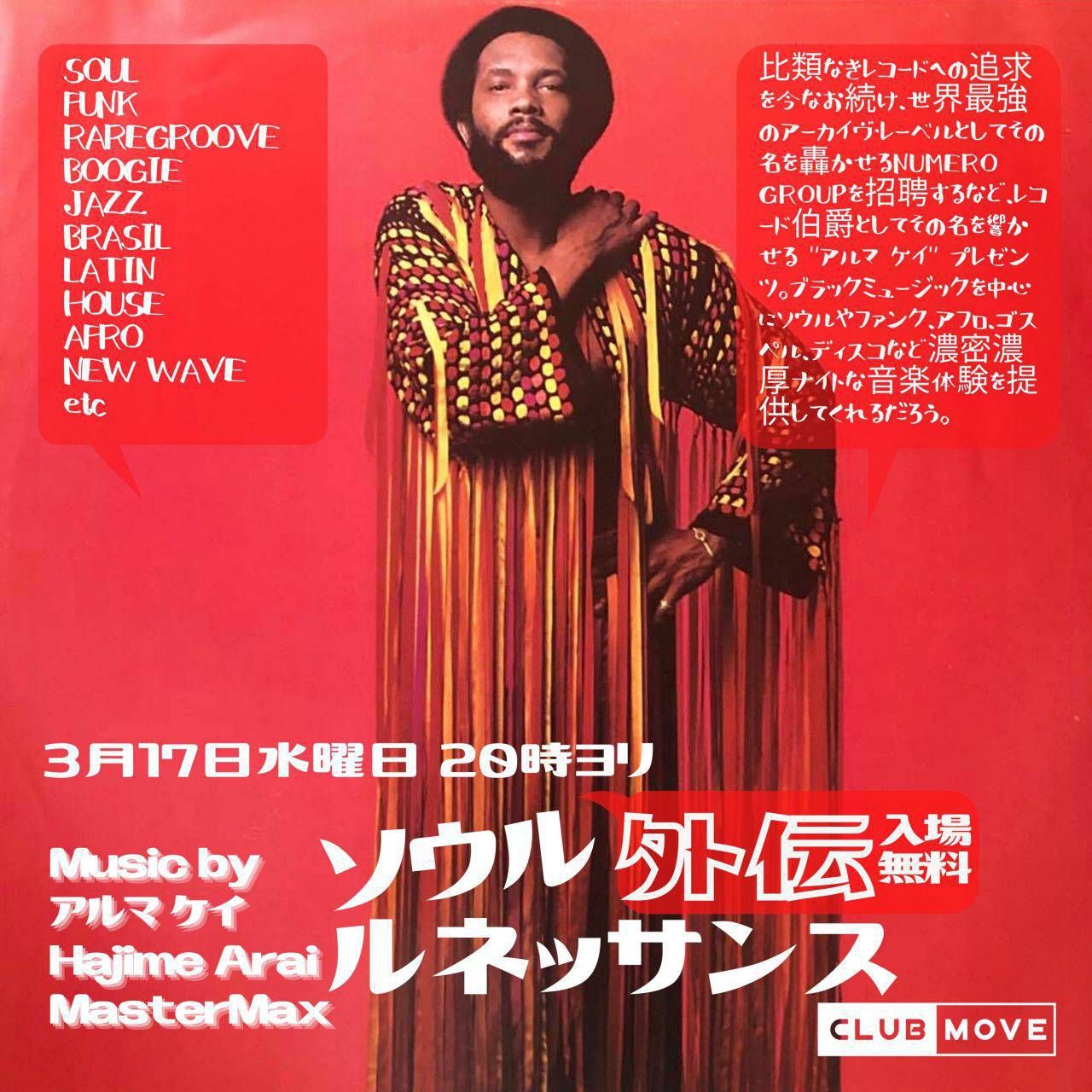 比類なきレコードへの追求を今なお続け、世界最強のアーカイヴ・レーベルとしてその名を轟かせるNUMERO GROUPを招聘するなど、レコード伯爵として一部の間でしられる "アルマ ケイ" プレゼンツ。ブラックミュージックを中心にソウルやファンク、アフロ、ゴスペル、ディスコなど濃密濃厚ナイトな音楽体験を提供してくれるだろう。