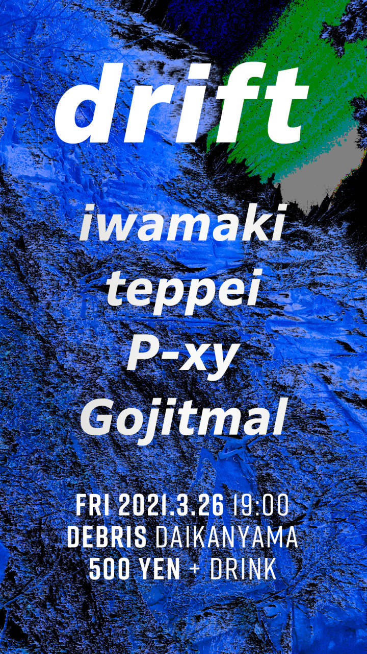 2021.03 26 MAR Drift TECHNO AMBIENT 0 Shares Facebook Twitter google Line DATE: 2021-03-26 FRI OPEN: 19:00 VENUE: PRICE: 500 yen + drink LINE UP: Gojitmal, P-xy, iwamaki, teppei