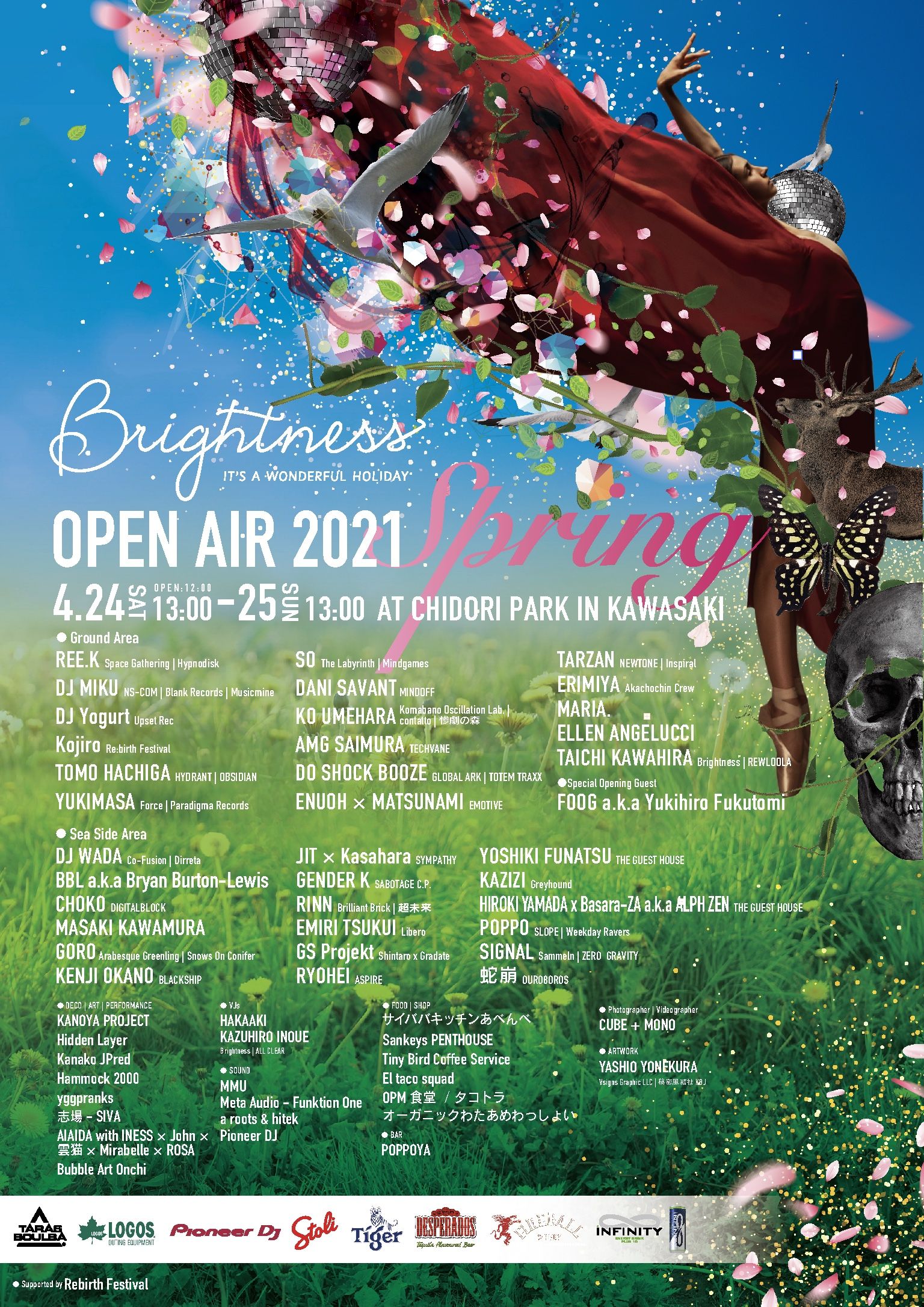 8年目を迎えるBrightnessは「 再生 」をテーマに、海沿いの景観も美しく広大な芝生スペースが開放的な神奈川県川崎市は‘ちどり公園’に夢のある空間を創造いたします。多様なアーティストやパフォーマーが結集し創られるこの春の祭典では、長時間に及ぶ開催を遊びきれるようイベントを設計。TARAS BOULBA / LOGOSによる疲れた体を癒せる休息スペース、ハンモックが点在するチルアウトエリアを十分に確保し、手軽に行ける都市型の野外フェスとして運営。広々とした芝生スペースに出現するGround Areaには日本を代表するDJアクトが勢揃し、また海風も気持ち良いSeaside Areaに登場するバラエティに富んだアクトも見逃せない。不安と混沌が支配するコロナというこの新時代を突き抜け、その先にある輝ける未来を目指し心が躍る春の日となるよう主催陣一同で全霊を持って取り組んで参ります。東京からのアクセスも良く会場は川崎駅からタクシーで10分の距離となります。この春、ちどり公園で皆様にお会い出来る事を一同楽しみにしています。