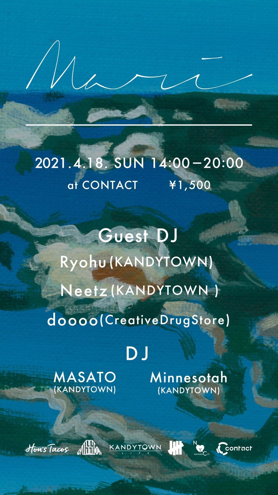 SuchmosやBase Ball Bearとのコラボレーションやバンド、ズットズレテルズのMCとしての経歴などメジャーフィールドでの活動と、KANDYTOWNでの際立った異彩や、昨年11月に発売されたアルバム「DEBUT」では、トリッキーなビートメイクや、ホットなファンクネスに叙情的なフロウがのる、深い音楽感に裏付けられた飛び抜けた才能を知らしめたRyohu。MIKI、RyohuとともにKANDYTOWNメンバーのほとんどのビートを担当するNEETZは、自らのリリースでも他に類を見ない、はっとするようなビートコントロールを披露しKANDYTOWNの根幹/神経伝達細胞としての優れたクリエイティビティを示した。巷では、噂の“人肉小銭入れ”の話題が先行するクリエイティブチームCreativeDrugStoreのdooooだが、それはファーストアルバム「PANIC」からのインスピレーションの派生からの産物であり、そこでは磁場を震わすようなドープな世界観が繰り広げられている。ディスコ、ハウス、レアグルーヴからファンク、そしてもちろん現行ヒップホップ〜R&Bまでが渦巻くmariが、今回、先述した三者を招いてこのパーティのある到達点を攻める。音楽だけでなく、サブスペースには次世代のアートシーンを牽引する気鋭のドローイングアーティストSUGIによるセレクトのショップやフードが立ち並ぶ。