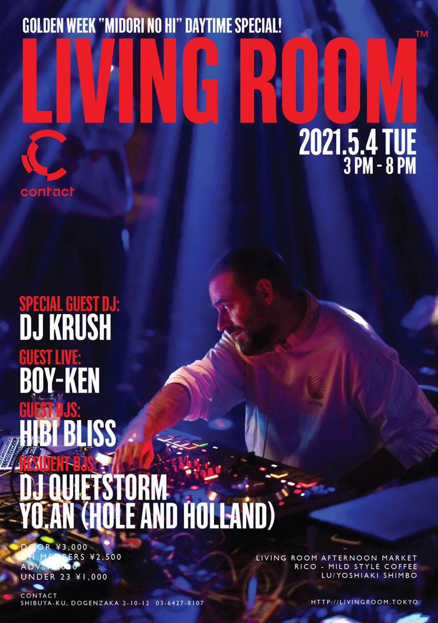 Quietstorm。彼だからこそ為し得ることのできる特な一夜にはこれまでに、平日のデイパーティにも関わらず東京のトップDJ/アーティストばかりを招き、音楽を愛する多くの人々を魅了してきた。決まりきったブースとダンスフロアの定位置をひっくり返し、DJがフロアのど真ん中のソファに座り、自由に遊ぶ来場者に囲まれDJする、革命的なニュースタイルを生んだ噂のパーティをぜひContactのStudio Xフロアで体感してみてほしい。今回は祝日みどりの日に開催ということで、スペシャルゲストにDJ KRUSHを迎え開催される。
