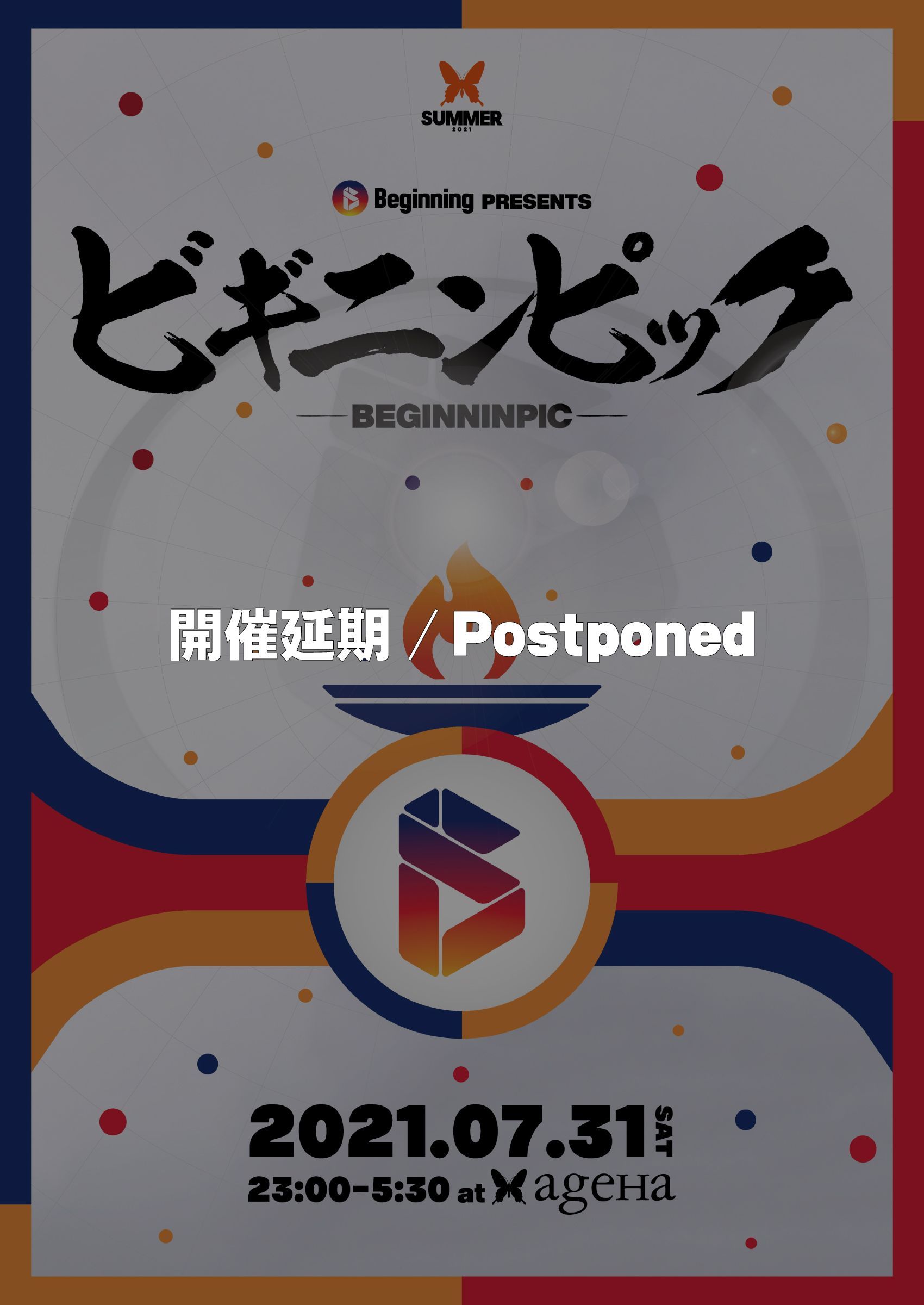 2021年7月31日(土)に予定しておりました『Beginning presents BEGINNINPIC』は、緊急事態宣言に伴う政府及び都からの酒類提供の自粛及び休業要請を受け、下記の日程へ開催を延期いたします。