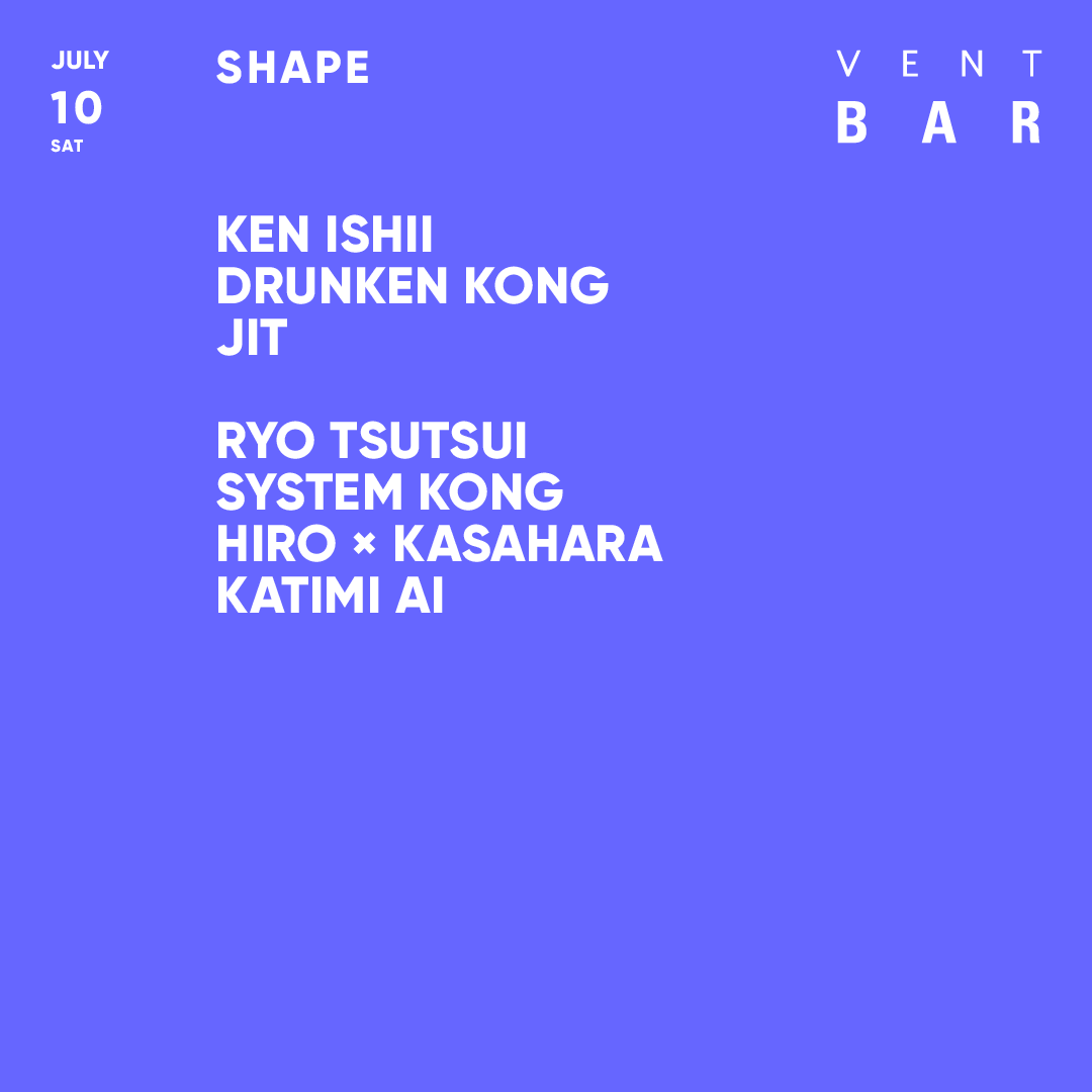 【 東洋のテクノゴッド KEN ISHIIをゲストに、DRUNKEN KONGが主宰する新パーティー SHAPEが7月10日のVENT BAR で開催! 】