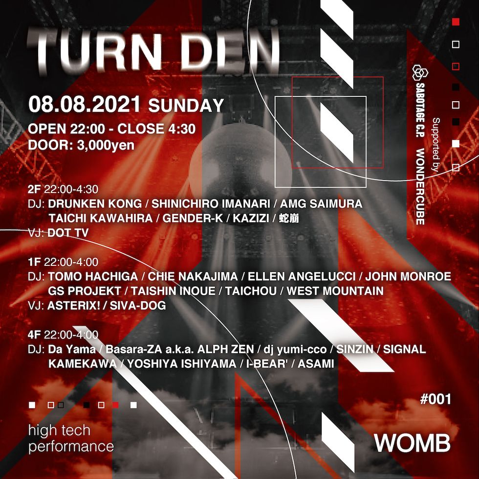 Christian Smith のレーベル Tronic 等からアンセムチューンをリリースし続け不動の人気を誇る DRUNKEN KONG、自身のトラックが SAMA' や Amelie Lens、Fatima Hajji などの世界のトップ DJ に使用される 09RECORDINGS 主催の SHINICHIRO IMANARI、Chris Liebing、Lucy、REBEKAH、T47、Monoloc 等を招聘し TECHVANE を主催し東京テクノシーンをリードする AMG SAIMURA、春に開催されたレイブパーティーも大成功に収め、今もっとも勢いのある Brightness 主催 TAICHI KAWAHIRA、沖縄を拠点に Party production SABOTAGE C.P. を立ち上げ活動し、そして TURN DEN のオーガナイザーでもある GENDER-K、更に東京クラブシーンにおいてさまざまな影響を与え続けている計24組の DJ が出演!!