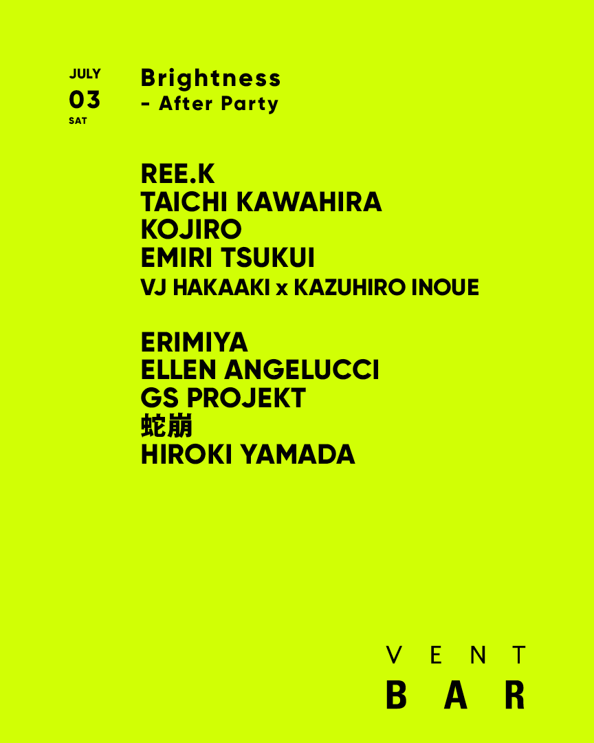 本年で8年目を迎えたBrightnessはこの春2年ぶりに野外フェスティバルを開催したばかりだ。幅広いジャンルの、豊富な経験/キャリアを持つ東京を中心に活動するローカルDJが数多く出演し盛況となった“Brightness Open Air 2021 Spring”のアフターパーティーがVENT BARで開催される。