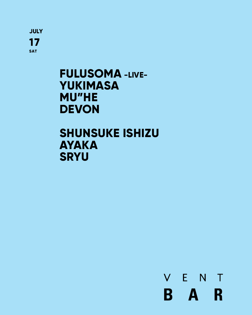 ROOM1には、ハウス/テクノのDJとしてキャリアをスタートし渡英を経てベース/ジャングル/ハードコアなど様々な遍歴を重ね、現在はテクノ・アンビエントパーティーPandoraをBonoboにて定期開催し精力的に活動を続けているBun Saitoと、モジュラーシンセを巧みに操るO-Maによるユニットfulusomaがハイブリットライブセットを披露。ここVENTでもClaudio PRC、Acronym、Takkyu Ishino、TAKAAKI ITOHなど名だたるアーティストと共演を重ねてきたユニークなプレイは必見だ。