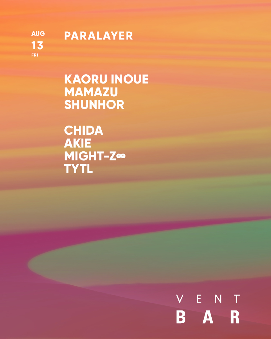 89年にアシッドジャズの洗礼とともにDJカルチャーへ没入し、以降自主レーベル“Seeds And Ground”を中心に国内外のレーベルから数々のリリースを果たして来たKAORU INOUE a.k.a CHARI CHARI が久々にVENT BARへ登場する。昨年実に18年ぶりに発売されたCHARI CHARI名義でのアルバム“WE HEAR THE LAST DECADES DREAMING”は瞬く間に市場から姿を消し、多くの話題と賞賛を集めたが、まもなくリリースされる本アルバムのリミックスには、この夜出演するCHIDA、Mamazuが参加し全てのアートワークをshunhorが手がけた所縁もあり、オーガニックなサウンドを中心に活動する3世代のDJ、 Kaoru Inoue – Mamazu – shunhorが「東京の夜に新たな色を加える」ことを提案するパーティー“PARALAYER”は盛夏の中スタートする事となった。