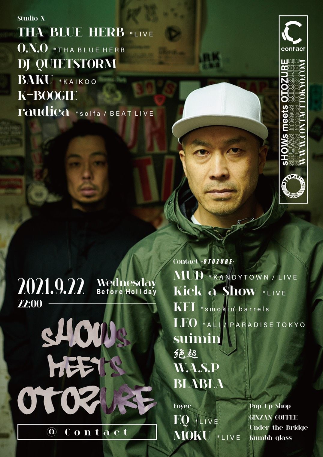 Contact/Foyerフロアでは“都市に現れる異種遊戯格闘技場”OTOZUREが第九幕を迎える。2018年3月に始動しアートやカルチャーを巻き込みながらこの地下クラブの磁場を度々くるわせてきたOTOZURE。今回も、KANDYTOWNからMUD、七曲八飛のEQ、シンガーKick a Show、サイケ感あるフォーキーなバンドMOKUの4本のライヴと、smokin' barrelsの片翼KEI、多国籍ルーツミュージック・バンドALIのフロントマンLEO、膨大なイマジネーションとそこに発生する強烈な歪みを鳴らすsuimin、アヴァンギャルドなファンクネスで紡ぐオルタナティヴ・サウンドW.A.S.P、PACK3のメンバーでラッパー/ビートメイカーBLABLAや、絶超のDJ、さらにはKUMBH GLASSによるガラス作品で視覚からも高次元を生み出し、one of a kindなアパレルUnder the Bridge、みんな大好きGINZAN COFFEEと、強力かつ高濃度のラインナップが名を連ねる。