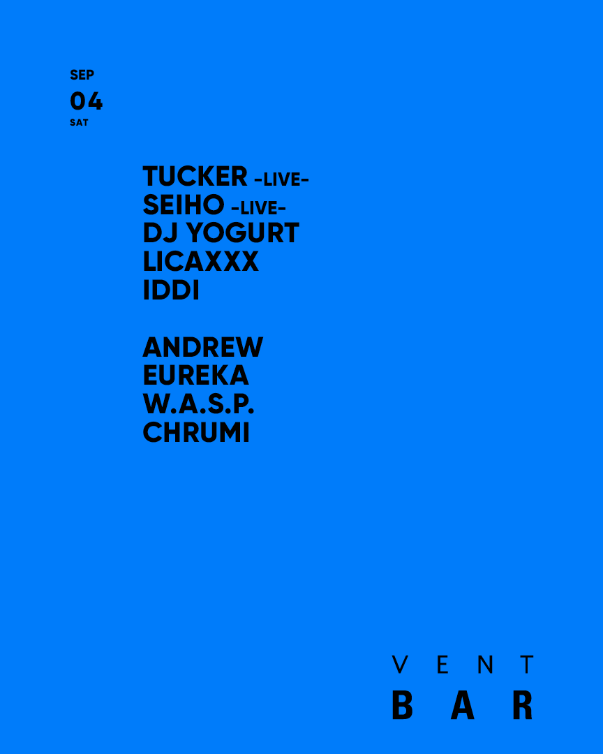 デビュー以来、ヒップホップやポストダブステップ、エレクトロニカ、チルウェーブなどを取り入れたサウンドで注目を集めSonar Sound Tokyoに国内アーティストとしては初の2年連続出演を果たし、Flying LotusやDisclosureとのツアーをはじめとした大物アーティスト達との共演やプロデュースを行い、Avec Avecとのポップ・デュオ=Sugar’s Campaignとしても活躍するSeihoと、90年代からエレクトーン奏者として活動しSNS上で度々発表される日常の中にある音をきっかけにした作曲パフォーマンスが大きな話題を集めるとともに、現場でのライブでも70年代のエレクトーンを武器にパンク/ヒップホップ的初期衝動と即興性を掛け合わせ、ドラム、ギター、ベース等をたった一人で駆使するオリジナルスタイルのライブパフォーマンスで魅せるTUCKERが、VENT BARで共演を果たす。