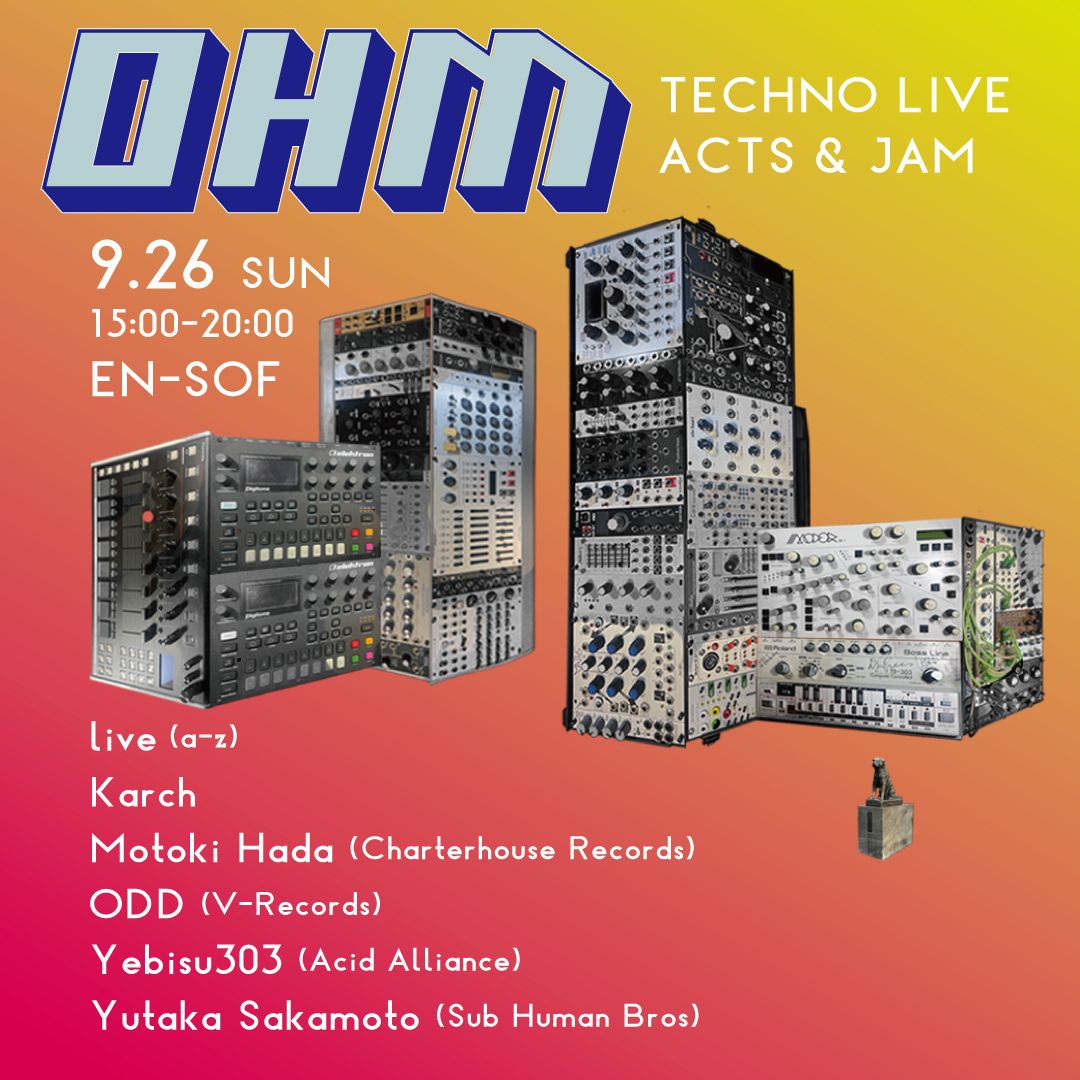ターンテーブルもCDJを撤去し、シンセサイザー、ドラムマシーン、サンプラーなどの機材を並べて、テクノ、ハウスのライブでつないでいくパーティー “OHM” を開催します。