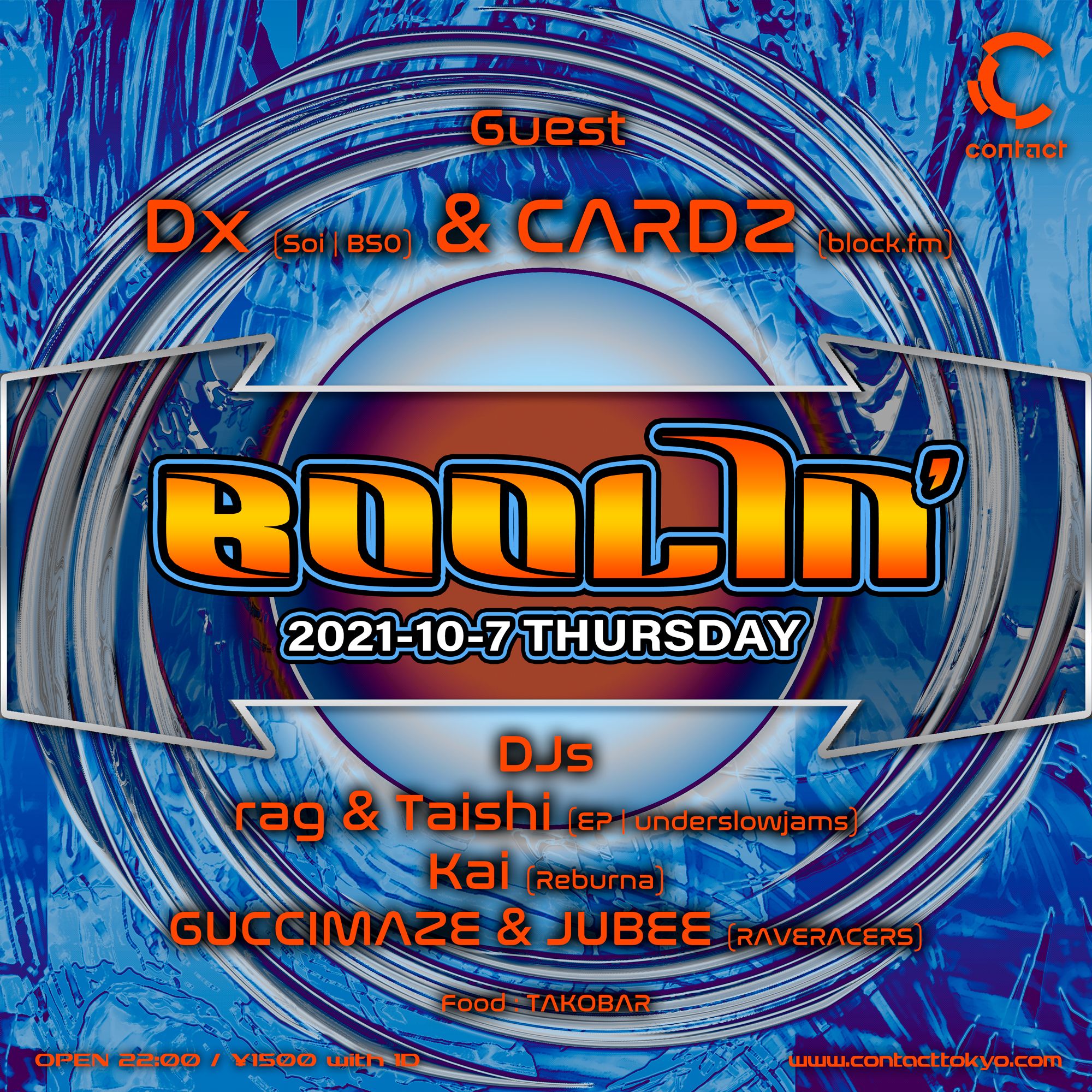 rag & Taishiが発起人になり、1990年代に始まったドラムンベースを2021年版として再構築するパーティとして開始。過去や現在に捉われない現場でのドラムンベースを中心にRave Racersとして活動しているGUCCIMAZEとJUBEEを加え、当時のシーンと現在のシーンを繋ぐ最重要集団の集合体。90年代当時のレコードを巧みに使い、現在のビートとを混ぜるミックススタイルのTaishiにunderslowjamsのラッパーであるragのフリースタイルなMCがさらにフロアを盛り上げる、またKaiは新感覚のオリジナルトラックを織り交ぜたプレイスタイルで駆け抜ける。またGUCCIMAZE、JUBEEと新たな世代の解釈した音楽性が交差する。初回ゲストは当時より数々のパーティを共に参加し、24年目に突入したSoi ProductionsからDxと歴戦のMC CARDZの共演は間違いない。もはや説明不要な二人はboolin’を盛り上げる事間違いなし。