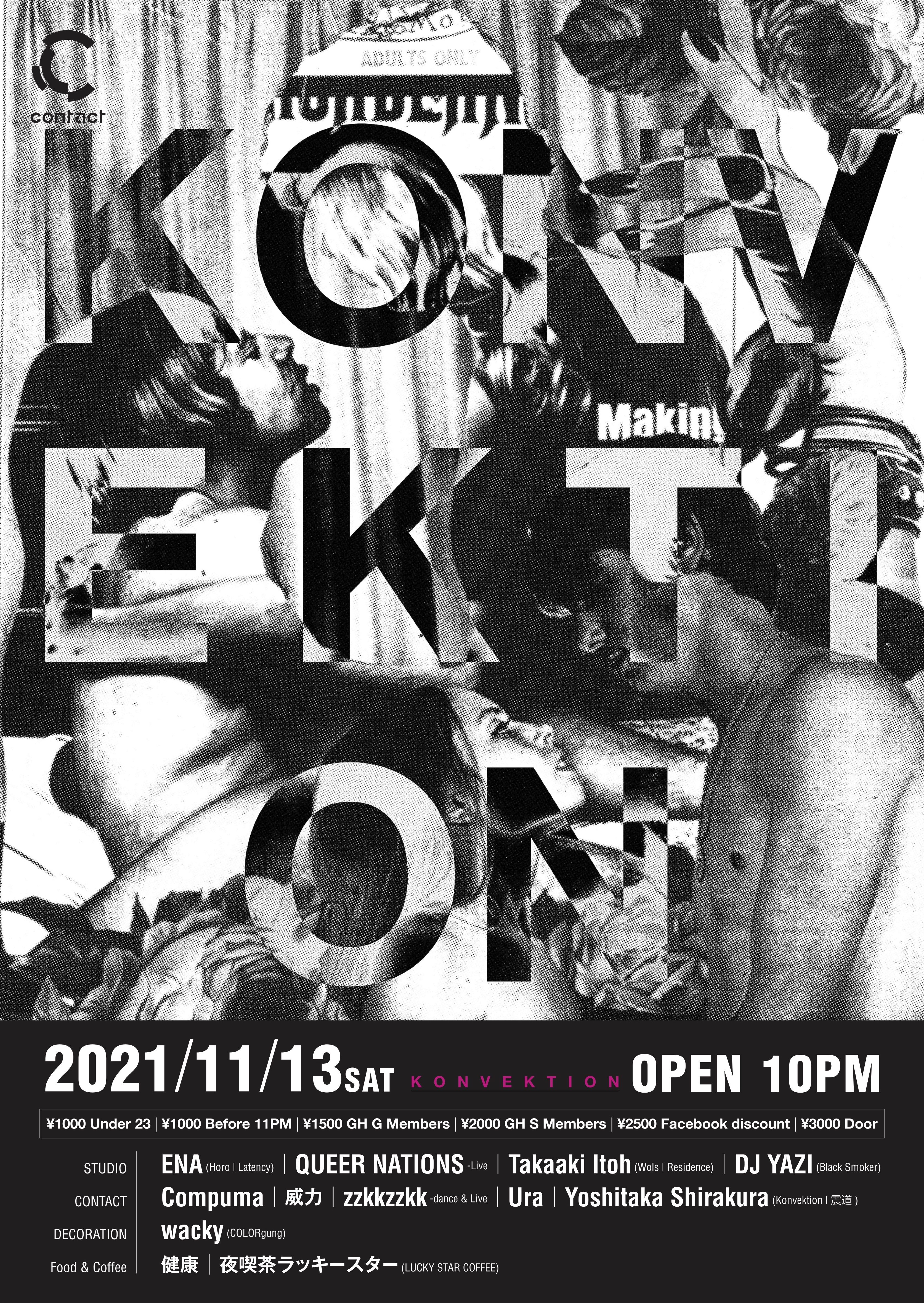 1990年代より日本のアンダーグラウンドテクノを拠点である東北のみならず海外へと伝播してきたTakaaki Itoh。Black SmokerやTwinpeaksとしての活動などジャンルを超越して深淵へといざなう表現者DJ Yazi、Yoshitaka Shirakuraが主宰するパーティ、Konvektionが2021年の晩秋に更なる多様性を携えてContactへと回帰する。深く陶酔的なダンスへと誘う独特な音楽性の作品を、ベルリンの〈Horo〉、パリの〈Latency〉、UKの〈Different Circles〉など錚々たるレーベルからリリースする他、国内ダブステップ最前線パーティBack to Chillの主要アーティストとしても知られるENA、ミュージックデュオCARREのメンバーとしてインダストリアルかつミステリアスな電子音のリリースを重ねてきたQUEER NATIONSのライヴがレジデントの2人とStudio Xをスリリングに構成する。Contactフロアには〈Black Smoker Records〉より悪魔の沼の一員としてDJミックスをリリースしてきた、あらゆる音楽への造詣の深さで知られるCompuma、独特かつ空想的な世界感をサウンドスケープとして具現化する威力、長年NYアンダーグラウンドシーンで嗅覚を磨き、海外レーベルから作品をリリースしてきたアンビエント作家Zeze Wakamatsuと舞踏家であるVee Kitazawaとのコラボライヴユニットzzkkzzkk、関西で磨かれた感性をヒプノティックなディープテクノで奏でるUra、そしてYoshitaka Shirakuraからなる濃密かつ多様な5組が登場する。国内アーティストの実験と披露、エクスペリメンタル、ノイズ、電子音楽の可能性の顕在化、そして言うまでもない漆黒のダンサンブルが渦巻くこの夜。壮大かつ高濃度、そしてある種の統一感を纏って、エレクトロニックミュージックの対流が意味する『Konvektion』への道しるべとして創出されることになりそうだ。