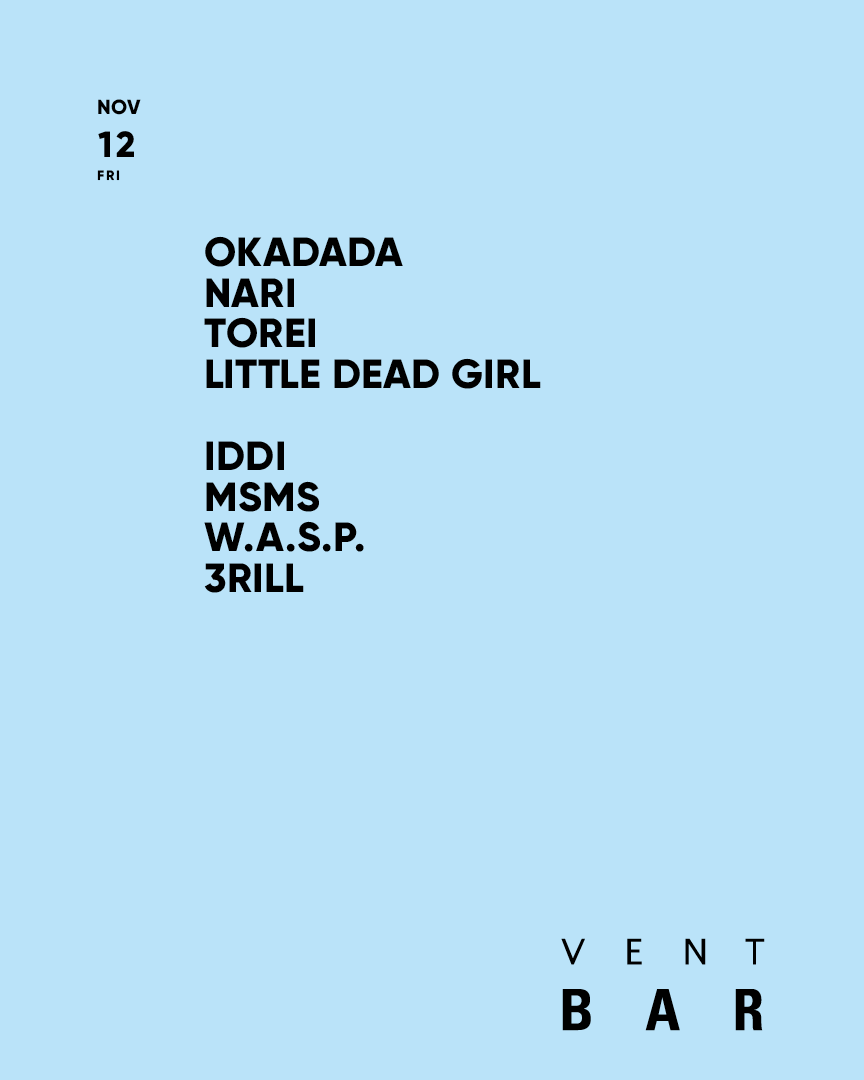 ネットレーベル“maltine records”からのリリースや、各種のリミックスワークと合わせ、大小場所問わず野外フェスからコアなパーティーへ出演し各地から注目を集め前例に無い幅広さで活動、2018年末には代官山UNITでの単独ロングセットを成功に収め、19年にはFUJIROCK FESTIVALにも出演を果たしたokadadaがVENT BAR へ久々の登場!ベースミュージックからハウス、ポップスまで実に幅広いトラック郡を一晩を通してひとつの形にまとめあげる多彩なプレイに期待して欲しい。