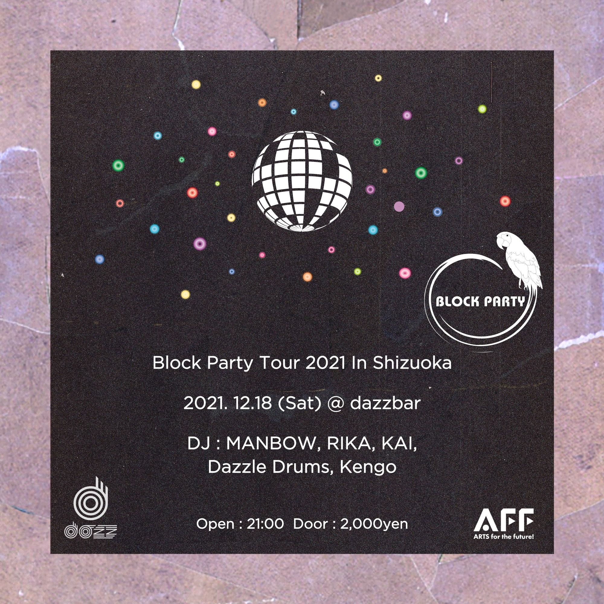 東京青山のクラブ0 Zeroにて毎月行われているDazzle Drums主催によるサンデーアフタヌーンパーティーBlock Party初の全国ツアー。ありがたいことにDazzle Drumsが10年以上前から繋がってきた静岡のシーンの人たちとパーティーします。ハウスミュージックを軸に90年代の東京から静岡を中心に活動するMANBOW、静岡RajishanでパーティーEuphoriaを中心にプレイするRIKA、パーティーOIDAKIから新しい波を作り出しているKAIと一緒に。大変な状況ですが、元気な方は少しでも寄ってみて下さい。感染対策にご協力お願い致します。
