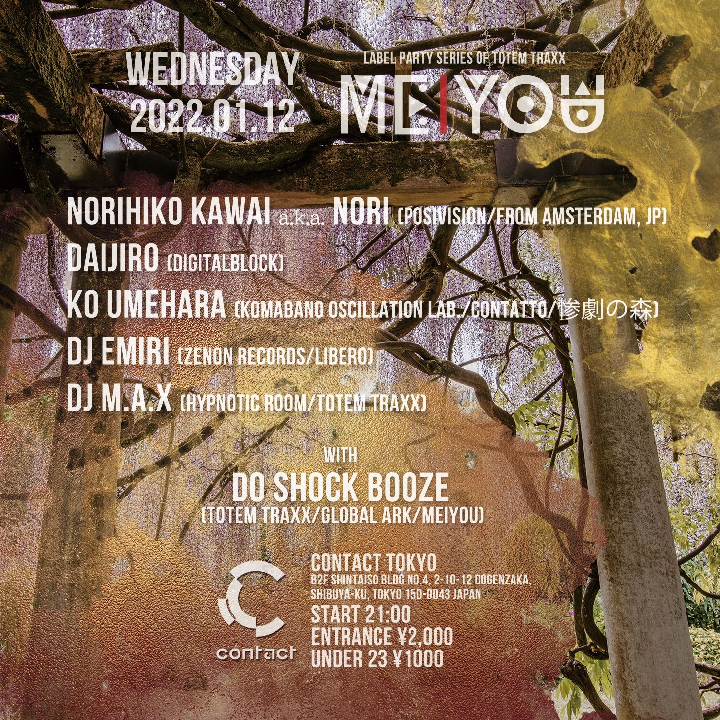 アムステルダムから帰還するNORIHIKO KAWAI a.k.a. NORIの登壇はこの日の大きなトピックの一つになっている。NORIHIKO KAWAIの日本の主流とは違った、扇情的なエレクトロニクスや、徐々に感覚を侵す精巧な構築と想像を越えた展開は、深いトリップ感がともなうパラノイアックかつイマジネーションの発展を促すモダンな進行を実現させている。Contactに初登場のDJ EMIRIは、現行サイトランス/テクノ・シーンで際立った才能であり、そのハイデジタルな目まぐるしい変化の中でのビルドアップが生む特異な高揚は、この日のNORIHIKO KAWAIとの対比を生み出す絶妙なデバイスとなっている。この両名とMEiYOUとのコンセプトの軌道の交差は、オープンエア・ダンスフェスのフリークスはもちろん、電子音楽のハードリスナーをも満足させるディープな空間を作り上げることになるのは言うまでもない。