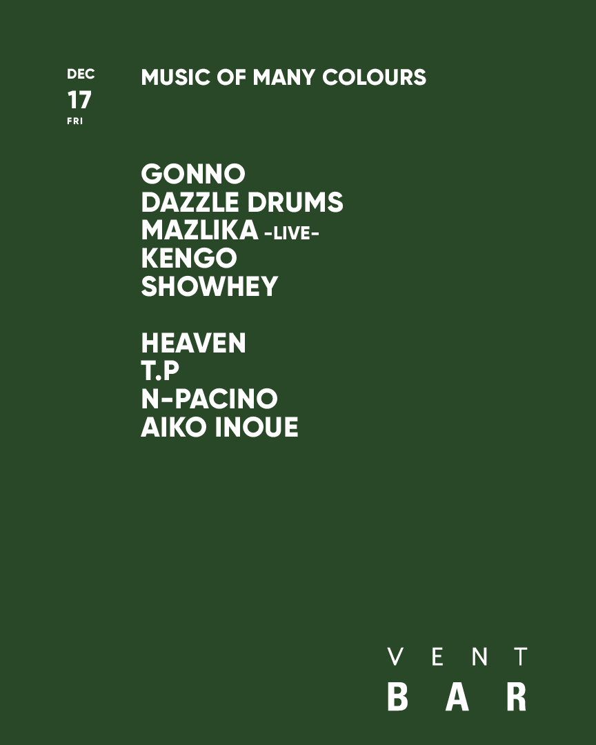 DJ Harveyも作品を残すカリスマ的レーベルInternational Feel、ニューヨークのBeats In Space、ロンドンのPerc Trax、ベルリンのOstgutTonなど名だたるレーベルから作品を発表し、Laurent Garnier、James Holden、Francois Kevorkianなど著名DJからもサポートを受けてきたGONNOをゲストに迎え、Gilles PetersonやLouie Vegaからも絶大なサポートを受けるDazzle Drumsが主宰するパーティー“Music Of Many Colours”がVENT BARで開催!
