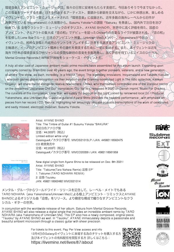 環境音楽とアンビエント・ミュージックは、我々の日常に安堵をもたらす美徳だ。今回あ りそうで今までなかった、この音楽をリードする本場、日本を代表するアーティスト、重 鎮から新鋭を交えながら、じかに体感出来、楽しめるイヴェントだ。グラミー賞にノミネ ートされた『環境音楽』に収録され、近年多数の海外レーベルから旧作が再発されている Inoyamalandと小久保隆から、Susumu Yokotaへの讃歌『Sakura』を発表し、国内外で注目を浴び始めている女性クラシック・ミュージックのギタリスト、AYANE SHINOや、世界 中に高く評価を得た、国産のアンビエント、チルアウトの集大成『音の和』でデビューを 図ったChillaxらの貴重なライヴが披露される。『音の和』を監修したLone Starクルーと日 本のアンビエント神童、Unknown Meのメンバー、Yakenoharaが今回のイヴェントの、純 粋な至福と内省用のサントラをプレイする。日本を代表するアンビエント・ミュージック の主軸達が、イーノのアンビエント精神とその進化を賛美するために一堂に集結する。ま た、本イヴェントは近年海外で日本の環境音楽及び他ジャンルの良質な新旧の音楽を多数 再発し、高く評価を得ているスイスのレーベル、Mental Groove RecordsとWRWTFWWを ショーケース・イヴェントだ。