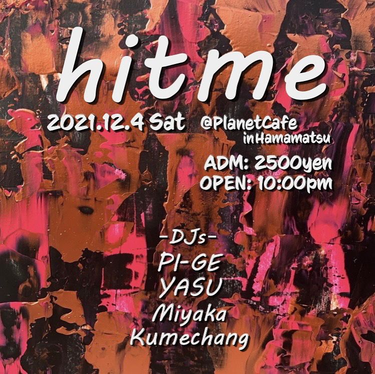 2021.12 04 DEC hit me PICK UP HOUSE TECHNO MINIMAL 0 Shares Facebook Twitter google Line DATE: 2021-12-04 SAT OPEN: 23:00 VENUE: PRICE: 2500YEN LINE UP: PI-GE YASU Miyaka Kumechang