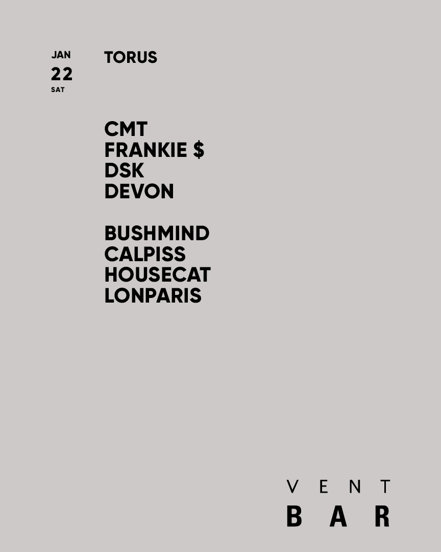 主宰パーティーPOWWOWとGARDENを基盤にし、国内外の現場で培った深く情熱的なDJプレイでアンダーグラウンド・シーンから絶大な支持を得ているCMTが希少なテクノセットで、去年から急激にその存在感を高めシーンで頭角をあらわしてきた“TORUS”に登場!本能のままに快楽を貪るような音楽体験の追求心と日本美学をテーマに開催される”TORUS”が、VENT BAR初開催の夜に、体の奥底から突き動かしてくるダンスミュージックを鳴らすラインナップを揃える。