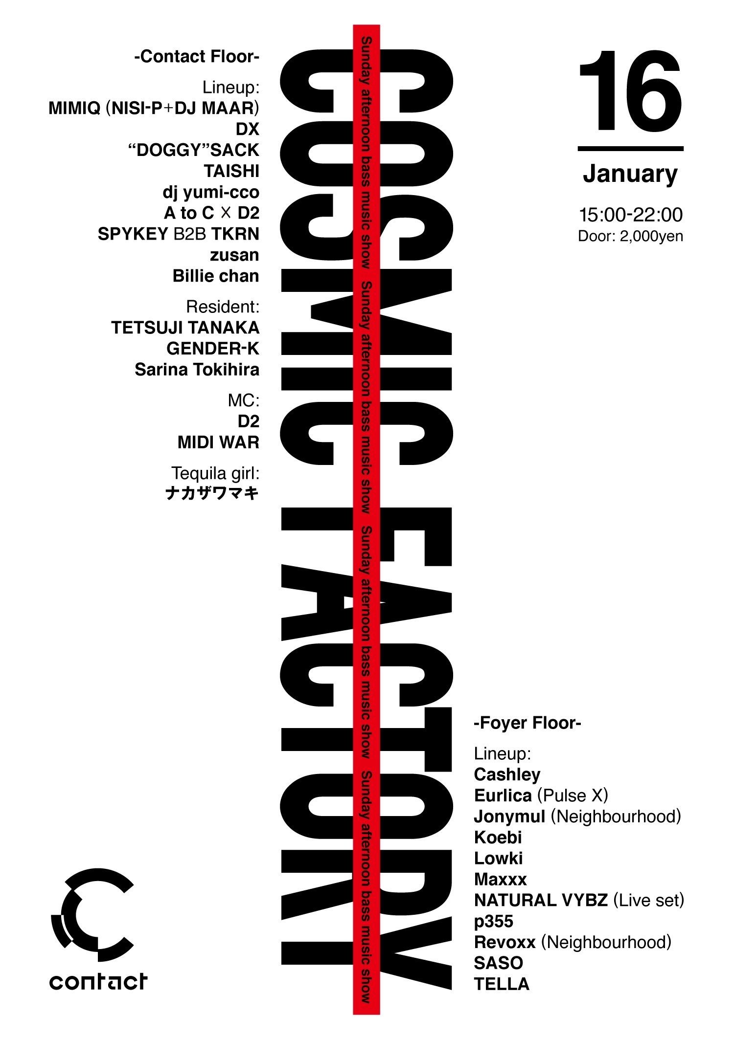 東京-沖縄を繋ぐ数々のビッグパーティをプロデュースしてきたTETSUJI TANAKAとGENDER-KのCOSMIC FACTORYが新たに仕掛けるコンセプチュアル・パーティをContactで初開催!ドラムンベース x ベースミュージックのクオリティーな側面をフォーカスした贅沢な空間を演出する。ヘッドライナーにベースミュージック日本代表としてクロアチアOUTLOOK FESTIVALに9年連続出演するなど国内外で活躍を続けるPART2STYLEのNISI-Pと元DEX PISTOLSで最新ソロアルバム「Disco Phychedelica」を発表したクラブシーンのカリスマDJ MAARの最注目ユニットMIMIQが現場初セッション。