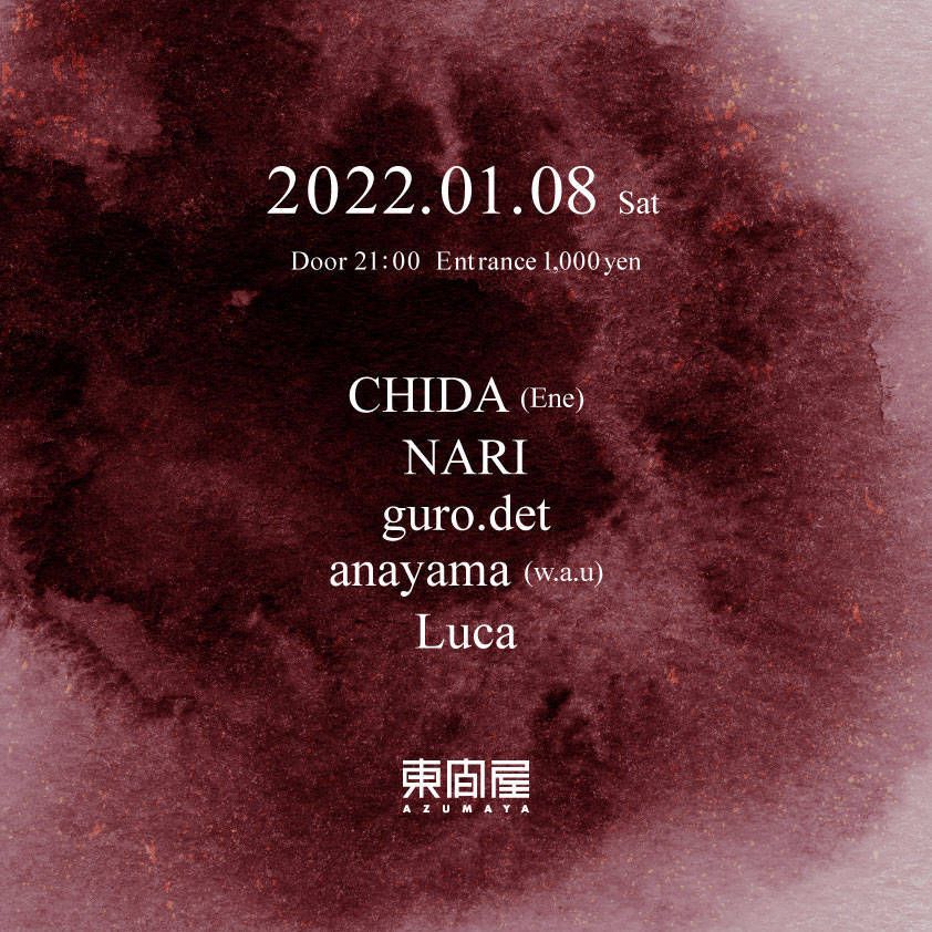 2022.01 08 JAN Azumaya -Saturday HOUSE 0 Shares Facebook Twitter google Line DATE: 2022-01-08 SAT OPEN: 21:00 VENUE: PRICE: Entrance 1,000yen LINE UP: CHIDA (Ene) NARI guro.det anayama (w.a.u) Luca