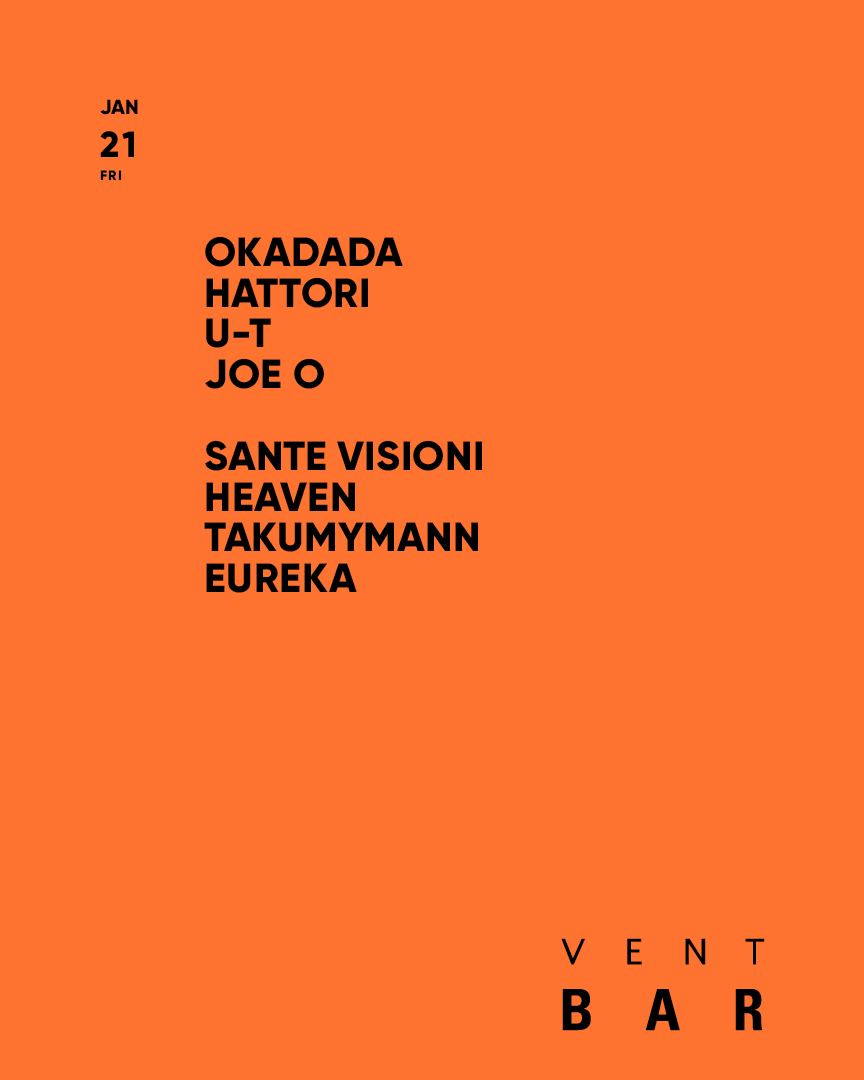 ネットレーベル“maltine records”からのリリースや、各種のリミックスワークと合わせ、大小場所問わず野外フェスからコアなパーティーへ出演し各地から注目を集め前例に無い幅広さで活動、2018年末には代官山UNITでの単独ロングセットを成功に収め、19年にはFUJIROCK FESTIVALにも出演を果たしたokadadaがVENT BAR へカムバック!ベースミュージックからハウス、ポップスまで実に幅広いトラック郡を一晩通してひとつの形にまとめあげる多彩なプレイに期待して欲しい。