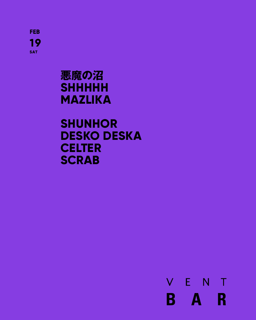ROOM1には、南米発のパーティー/アートコレクティブ集団 Voodoohop のコンピレーションLP“Voodoohop Entropia 1.5”のプロデュースや、民族音楽から最新の電子音楽全般を操り自由自在にフロアを演出する気鋭のDJとしてNicola Cruz、Chancha Via Circuito、BARRIO LINDOら数々のアーティストと共演を果たしてきたShhhhhも登場。オープニングは、VENT BARでもたびたび開催されるエッジの効いたラインナップが人気のパーティー“Living Leaving”でも活躍するMazlikaが務める。