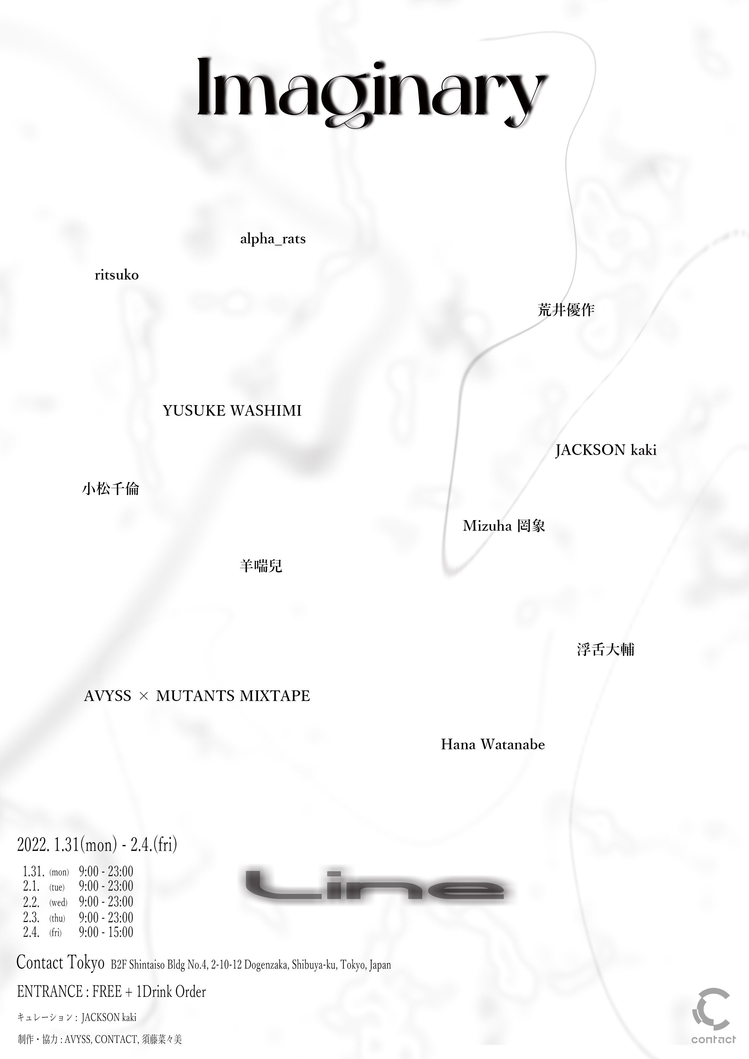 「Imaginary Line」は、クラブ Contact Tokyoを舞台とし、コンピューター・デジタルテクノロジー誕生以降を生きるアーティストをキュレーションした展示企画です。