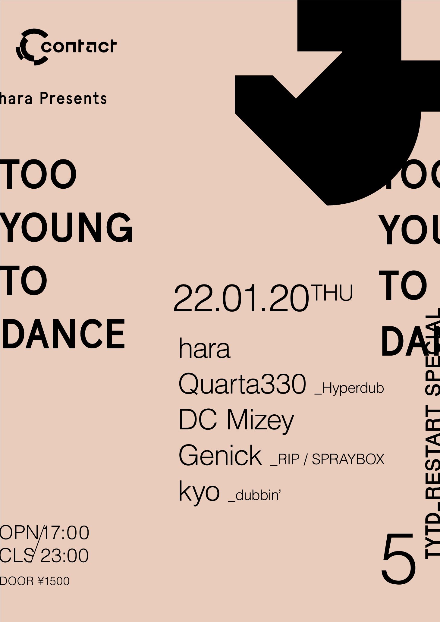 TOO YOUNG TO DANCEは、Pioneer DJのオフィシャルプレイヤーharaが、自身の活動と音楽感を交差させるピックアップ・アーティストを招集し、カルト的な熱狂をともなう音場を繰り広げるUKガラージ/ベースミュージック・パーティだ。今回ゲストに、Kode9主宰のUKレーベル〈Hyperdub〉唯一の日本人アーティストQuarta330を招聘。〈Warp Records〉Flying Lotusへのリミックス提供や、Thom Yorkeのウィークリー・チャートにシングルが選出されるなど、世界からチェックされるグライム/ダブステップの才能がContact初登場だ。さらに、beatmania IIDX、DANCERUSH STARDOM を始めとするアーケードゲームへの楽曲提供や、国産レーベル〈SPRAYBOX〉の共同創設者、Jacotanuが新名義DC Mizeyでの参戦。RIP、EPITAPHなどシーンの中でも特筆されるパーティの卓越したキュレーションや、アメリカ〈Attack The Music〉やUK〈Low Pitched Records〉といったレーベルからのリリースで注目されるGenickや、テクノやゲームミュージック/アニソン、最近ではMÖSHIの楽曲「Connected feat. ASOBOiSM」のトラックを手がけるサウンドデザイナーkyoなど、コンポーザーとしても高い評価をうける5アーティストが、ContactのシステムをUKマナーで完全解放させる。