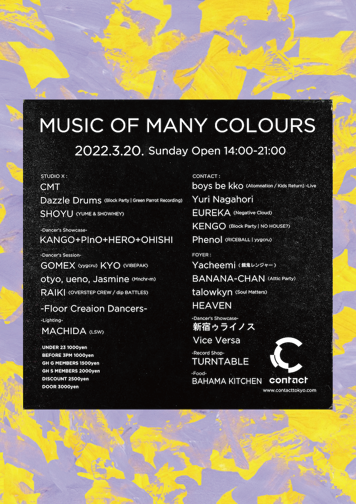 Contactフロアには、東京のアンダーグラウンドシーンにサポートを受けながら頭角を表し、クオリティの高い楽曲群が海外から正当な評価を受けブレイク必至のboys be kkoのライヴパフォーマンスに、ハウスを軸の中心に置きながら幅広い選曲で状況に対応するスキルを備える2人のDJ、Yuri NagahoriとEUREKAが出演。レギュラーDJ陣からは昨年Dazzle Drumsとともに全国7ヶ所の公演で出演を果たしたKENGOと休業期間を経て久々にDJブースに帰還するPhenol。