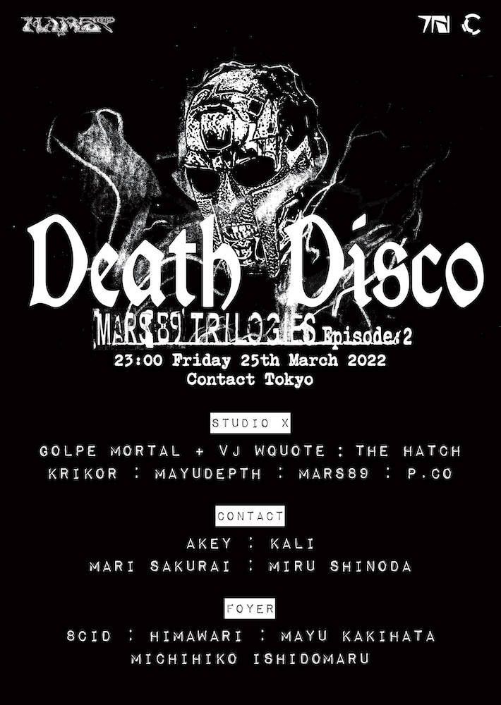 今回、映像作家VJ wquoteとともにライヴパフォーマンスを行うGolpe Mortalは、〈Hospital Productions〉のショーケースやPhase Fatale、Verset Zeroなど海外アーティストのサポートアクトとしても招聘される、インダストリアル/ウェイヴミュージック・シーンの国内最重要アーティストとして、際立った活動をみせている。ダークでコールドな音像のDJや圧倒的なマシンライヴは、Mars89と活動の軌道を交差させながらも違った景色のディストピアを映している。来日中のKrikor Kouchianもまた、本国フランスで発生していた過激なレイヴシーンや、クラブカルチャーの変革に深く関係しており、既存のシーンを拒否し続けてきた。音の生み出す予測不能な側面をプロダクションに落とし込む、緻密なフランス産のレベルミュージックとしてMars89と音楽感を共鳴させている。加えて、アフロ、現代ジャズやベースミュージックといった他に類を見ないオルタナティヴ・ロックバンドthe hatchのラインナップもこの怪異な夜の愉楽を一段と奇怪で熱狂的なものへと誘うことになりそうだ。さらに、MOTORPOOLのキュレーションを手がけるMAYUDEPTHや、Contactフロアで展開する、Akey、Mari Sakuraiといったミュータント・レイヴの精鋭によるハードグルーヴは、マグマのようなダンス欲を活性化させるこの日のガイドともいえる。