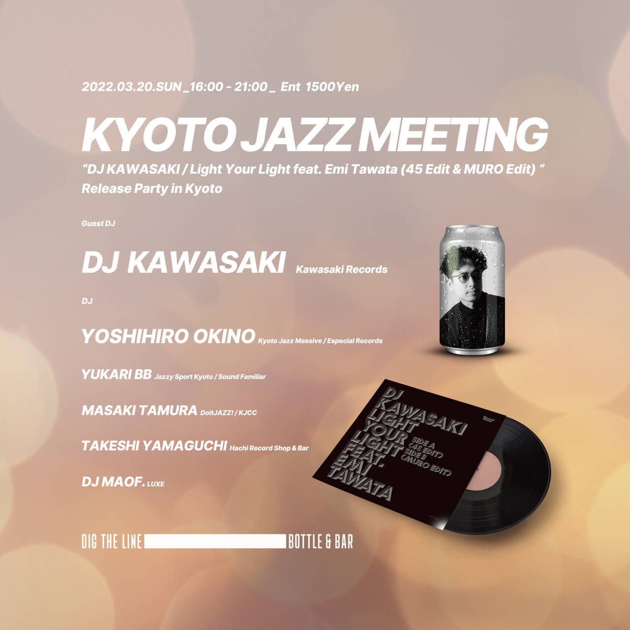 Kyoto Jazz Mssiveの沖野好洋主催、長年京都Collageで開催していたイベント「Kyoto Jazz Meeting」。Kawasaki Records第8弾シングルとしてKing Of Diggin’ MUROのEditを収録した“DJ KAWASAKI / Light Your Light feat. Emi Tawata”をリリースした”DJ Kawasaki”をGuestに、複合商業施設「新風館」1Fに位置する最先端ヨーロッパのクラフトビールと日本酒が楽しめる「DIG THE LINE BOTTLE & BAR」にて開催。