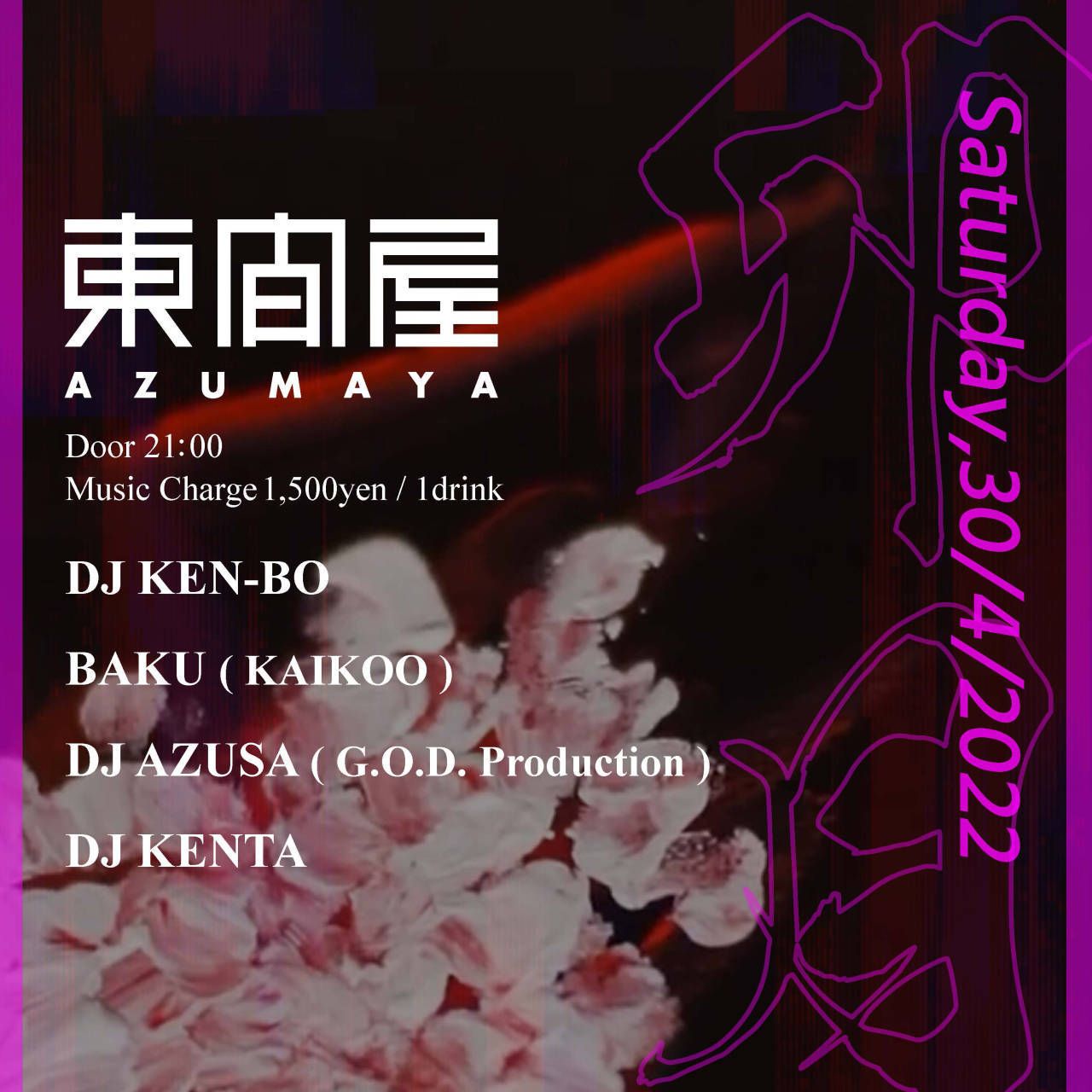2022.04 30 APR Azumaya -Saturday HIPHOP CROSSOVER 0 Shares Facebook Twitter google Line DATE: 2022-04-30 SAT OPEN: 21:00 VENUE: PRICE: Music Charge 1,500yen / 1drink LINE UP: DJ KEN-BO BAKU (KAIKOO) DJ AZUSA (G.O.D. Production) DJ KENTA