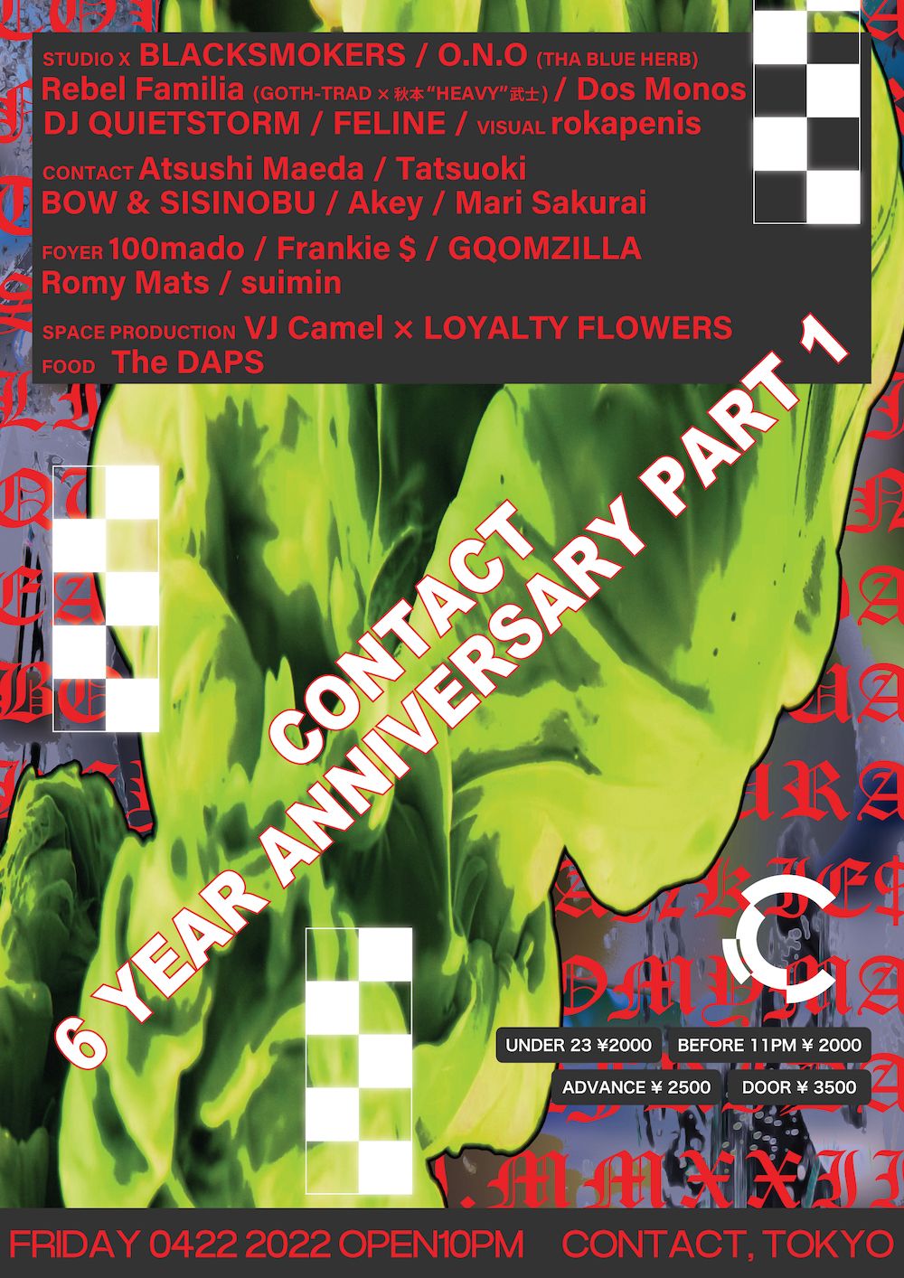 Contactフロアにはイベント制作のエキスパートとしての顔ももついぶし銀が集結。国内最先鋭のオープンエアーイベントruralのファウンダーAtsushi Maedaや、Broadを主催するTatsuokiといった細分化を重ねる精巧な電子音楽や、ZUNDOKO DISCOのBOWとSISINOBU、音楽溶鉱炉voltex主催Akeyや、地下シーンの看守Mari Sakuraiなど、Contactに熱狂を巻き起こしてきた、文字通りアンダーグラウンドシーンを牽引するリーダーが揃って至高に向けてのバトンをつなぐ。Foyerフロアでも、100madoやFrankie $といった国内ベース/ジャングル・シーンのトップに、コンテンポラリー電子音楽パーティ解体新書を主催するRomy Matsが描く電子音楽アート、DJ MoroとKΣITOによるGQOMZILLAのすさまじい相乗効果や、suiminの越境のサウンドジャーニーなど、各界のエリートが、ビートとエレクトロニクスを弾けさせ、これでもかと最後の周年を燃焼しにかかる。さらに、両フロアの映像/デザインを〈BLACK SMOKER RECORDS〉や〈Boris〉の専属VJとしても知られる映像作家rokapenisと、解体新書をサポートしてきたCamel、LOYALTY FLOWERSがヴィジュアルからのアプローチにより徹頭徹尾、非現実への解放を試みる。
