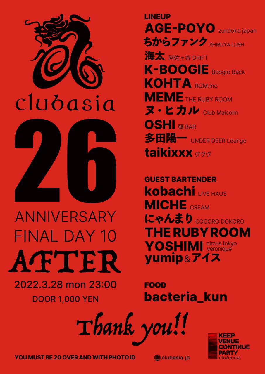 3月をclubasia 26周年月間として繰り広げられて来た数々のパーティーを締める"FINAL DAY.10"