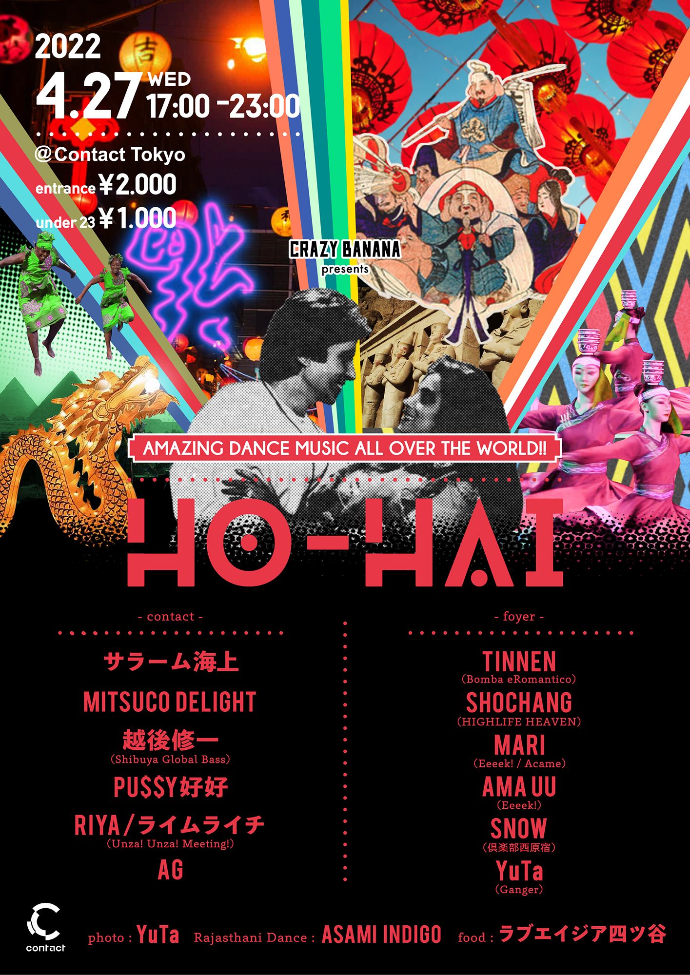 過ぎ行く春と力強く繁りはじめた若葉の薫りが交わる立夏目前の宵、2月からの延期を経たHO-HAIが、一足先の夏への入来を慶ぶ多幸的夜祭でカムバック。今回も世界各地の音楽の魅力を奏でる12人のエキスパートが一堂に会した。中国市街からシルクロードを巡りアフリカを経由、バルカン半島への地中海クルーズから、地球半周のフライトで温暖なカリブ/南米の旅程、世界の端まで行ったり来たり。CRAZY BANANAが送る、2フロアに渡って描かれる地球まるかじりの音楽旅行へ出発だ。
