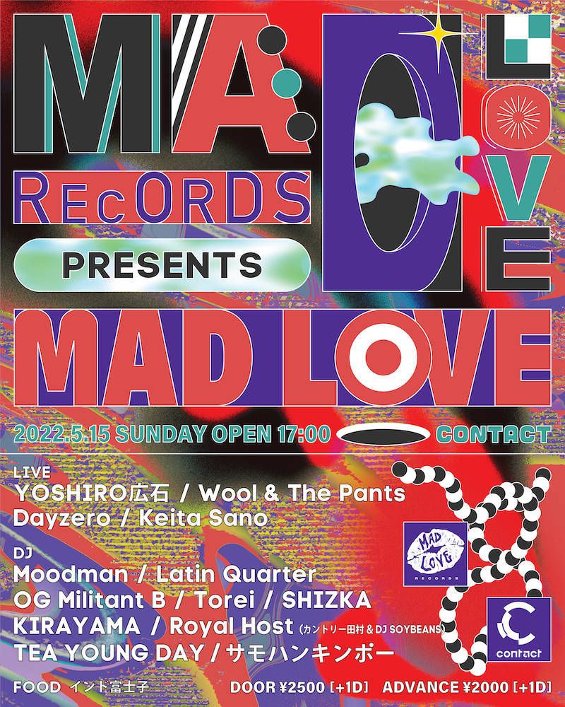 現在は岡山に拠点を置きながら〈Crue-L Records〉や〈Let’s Play House〉等、ダンスミュージック名門レーベルからリリースを重ね、世界中から支持されているエレクトロニック・プロデューサーKeita Sanoと出版レーベル、音楽レーベルの主催やDJ、パーカッショニストとして様々なフィールドで幅広く暗躍するDJサモハンキンポーによるオルタナティブ・ダンスミュージック・レーベル〈MAD LOVE Records〉のレーベル・ショーケースが開催。