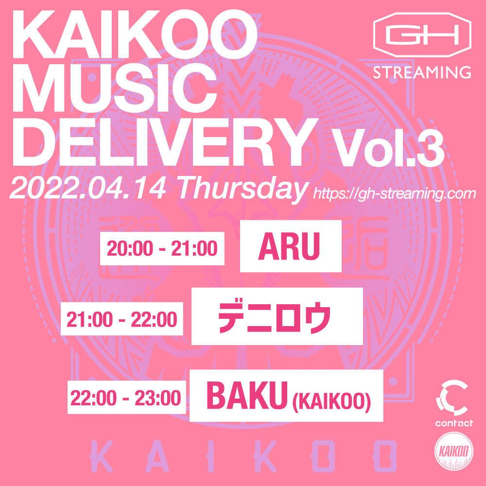 同じく3月16日にミックステープ「RUB DOWN」をリリースしたジャンルやルールに縛られず、音楽の魔法を魅せるDJ、デニロウによる新世代のネオソウル、ジャズ、ヒップホップが心地よく渦巻く、コズミックでドリーミーなDJプレイに加え、レーベル〈KAIKOO〉のボス、オルタナティヴ・ダンスミュージックBAKU(KAIKOO)のプレイ、3組の配信となる。