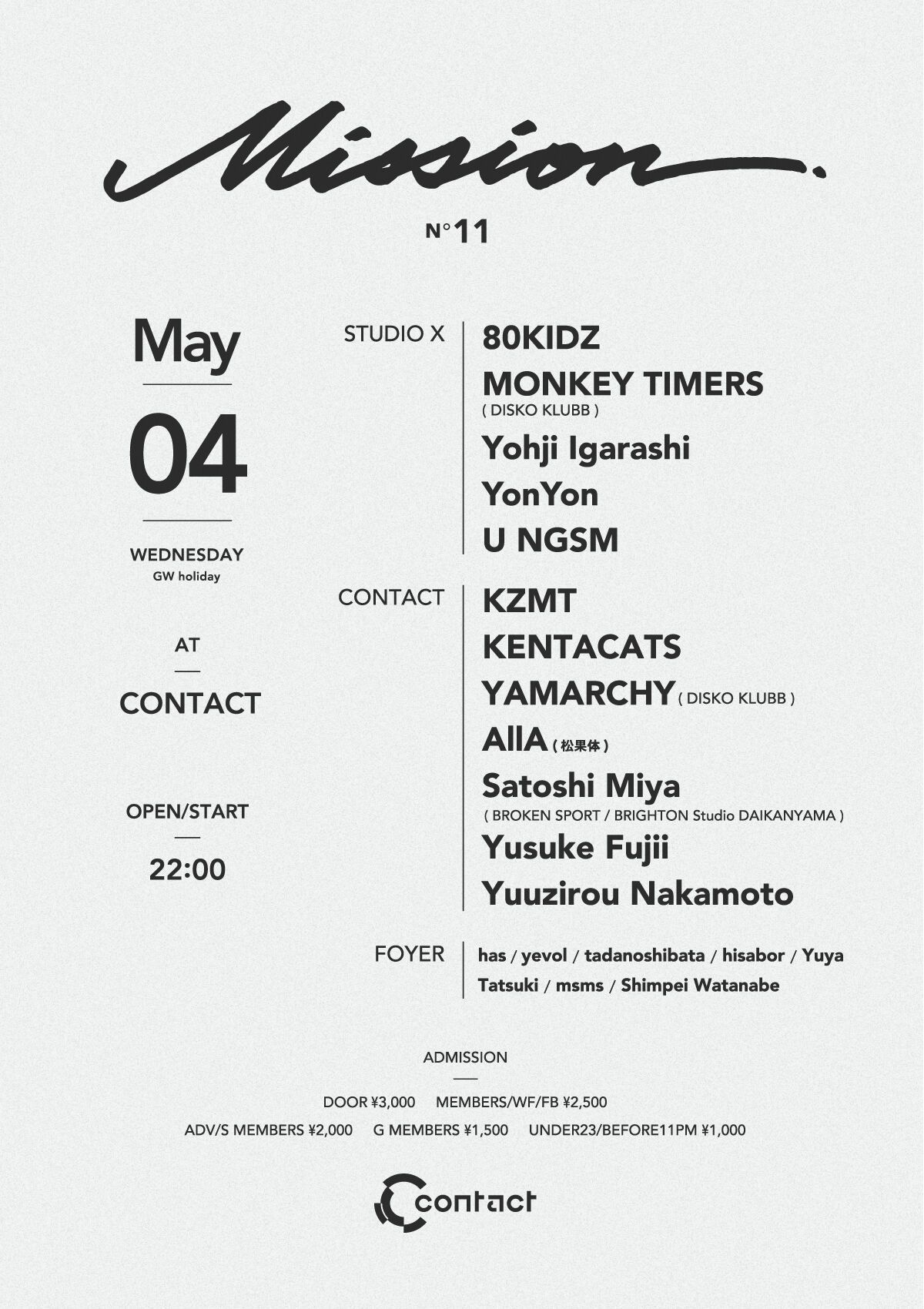 現Contactでは最後の開催となる今回は、アルバム「KLUBB LONELY」をリリースしたばかりのMONKEY TIMERS、プロデューサー・DJとして多方面から支持を高めているYohji Igarashi、DJ/シンガーソングライターとして活動するYonYonがStudio Xフロアに、SOUND MUSEUM VISIONで行われている人気パーティEDGE HOUSEのレジデントを務めるKZMTとKENTACATS等がContactフロアに出演。
