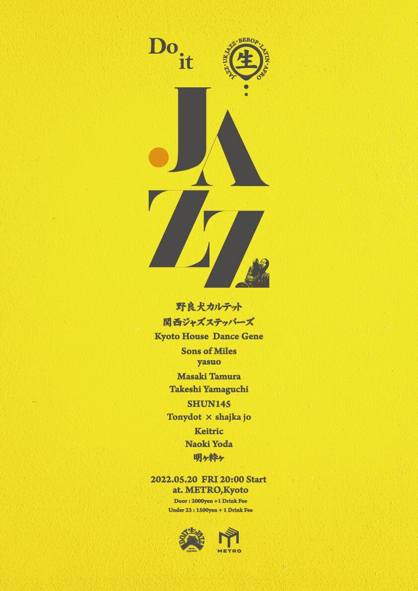 2006 年 に始動以降COLLAGEそしてMETROへと場所を 変え、クラブ以外でも屋上のルーフトップやカフェ・バー、ラウンジ、ショップレセプション、 国際写真展とのコラボレーション等活動を広げ、日本、世界の著名DJを招待し、京都のJAZZ/CROSSOVERミュージックを発信し続けてきた、"DoitJAZZ!"約二年ぶりに開催決定!”関西ローカルJAZZネットワーク”をキーワードに、大阪・神戸・京都からLIVE ACT・JAZZ DANCER、そして生音Jazzy Musicオンリーの選曲で送るべく、経験に裏打ちされた知識を持つDJが集合する。