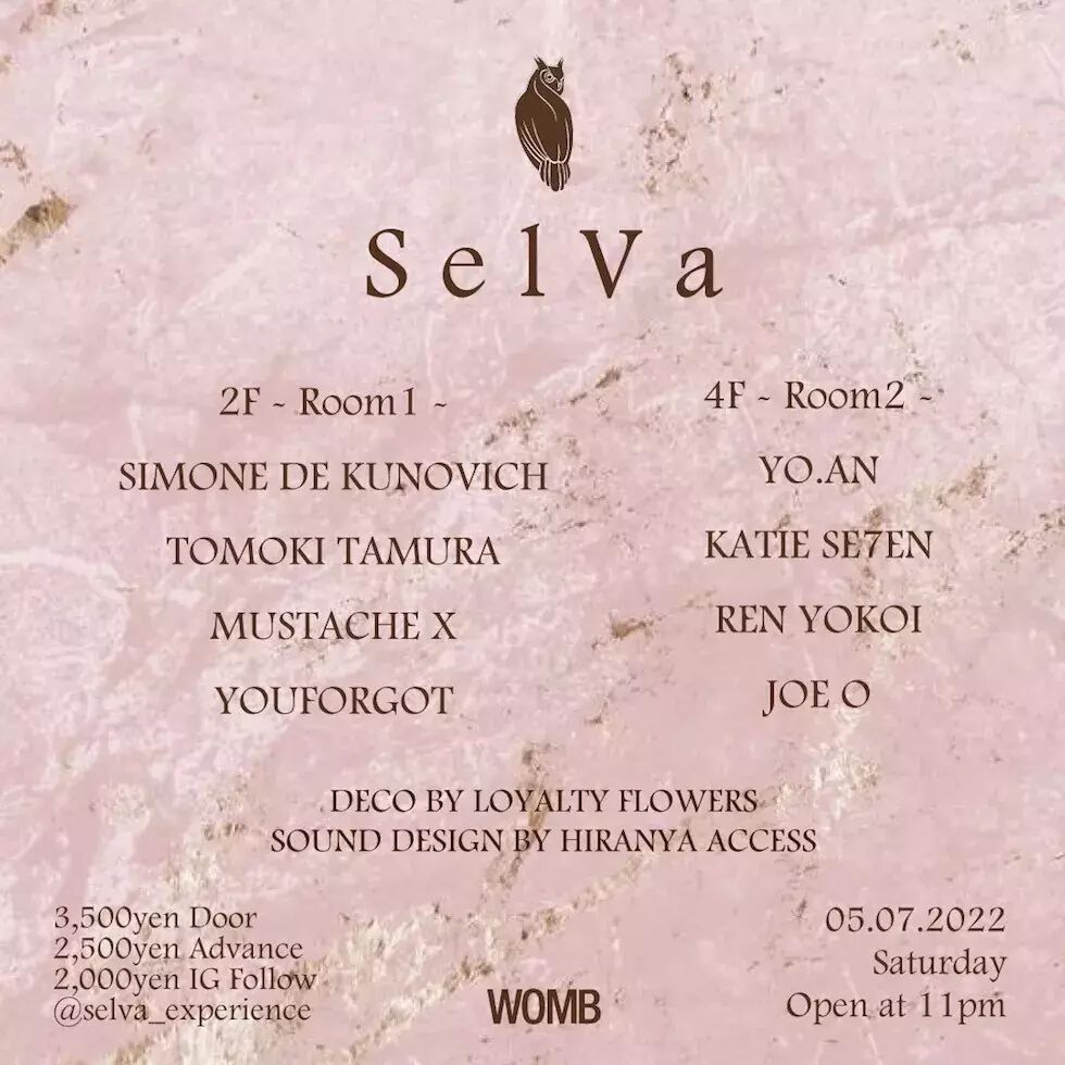 - DOOR: ¥3500 IG FOLLOW ¥2000 (@selva_experience) 前売り: ¥2500