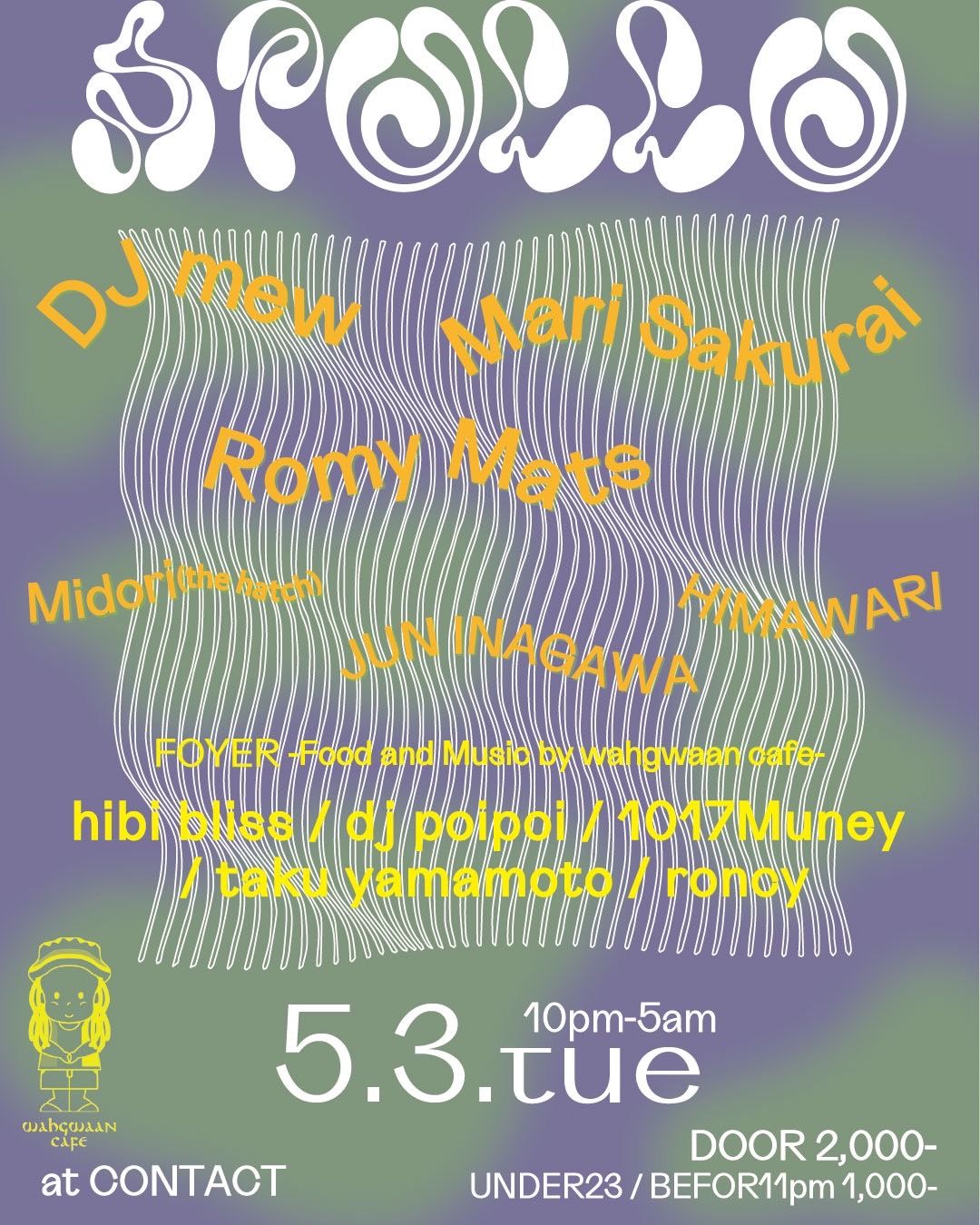 Foyerに出現したwahgwaan cafeでは度々セッションを重ねてきたhibi bliss、dj poipoi、RONCYを始めとしたダンスホールやヒップホップ、UKベース等のフィジカルミュージックの名手が、スピーカーをワイニーさせてフロアをバウンスさせる。